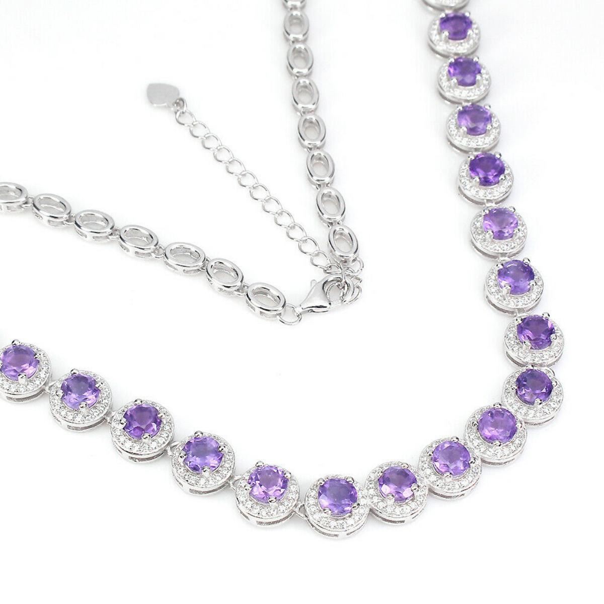925 STERLING SILVER;PLATE-14K WHITE GOLD;LENGTH (INCHES)19;MAIN STONE-AMETHYST;TOTAL WEIGHT-30.08 GRAM (TOTAL WEIGHT OF SILVER + STONE)DIMENSION-* STONE 5.0 MM. * CZ 1.0 MM. * TOTAL LENGTH 19.0 INCHES. * STONES PART LENGTH 270.0 X 8.0 MM.;MAIN STONE SHAPE-ROUND CUT;MAIN STONE COLOR- PURPLE;CLARITY/GRADE-IF TO VVS;LUSTER-GORGEOUS;TREATMENT-UNHEATED;ORIGIN-BRAZIL;HARDNESS-7;