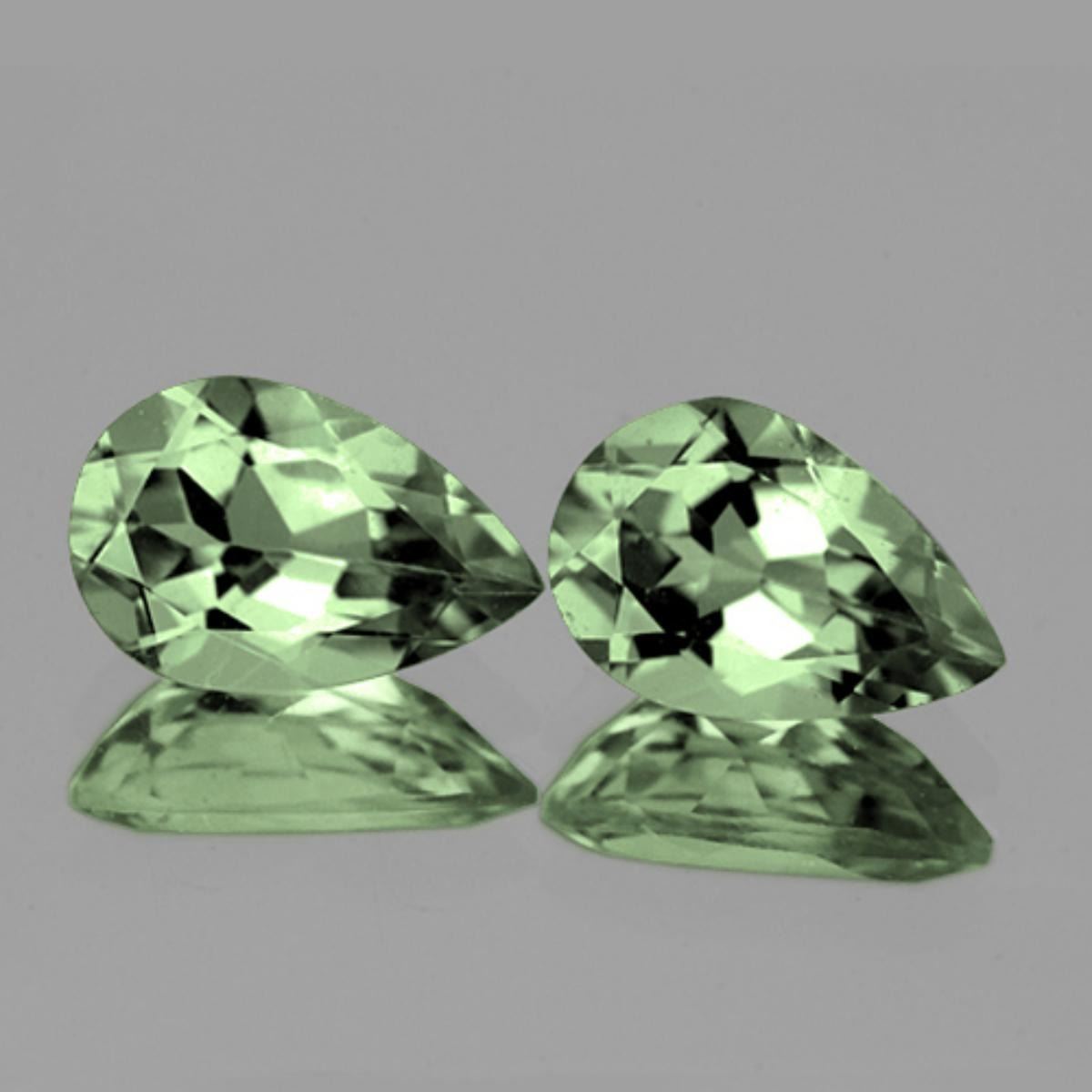 Natural Green Amethyst SHAPE : Pear SIZE ( L x W x D ) : 15 x 10 mm QUANTITY : 2 pieces COLOR : Green CLARITY : Flawless ORIGIN : Brazil HARDNESS : 7 LUSTER : Excellent!!! TREATMENT : Heated