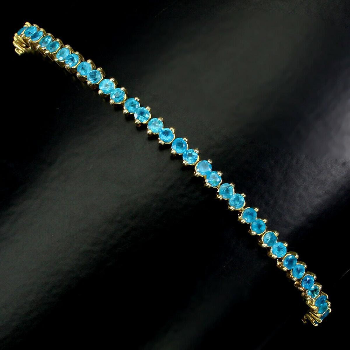 925 STERLING SILVER;PLATE-14K YELLOW GOLD;MAIN STONE-APATITE;TOTAL WEIGHT-8.82 GRAM (TOTAL WEIGHT OF SILVER + STONE)DIMENSION-* STONE 2.5 MM. * FACE BRACELET 171.0 X 4.0 MM.MAIN STONE SHAPE-ROUND CUT;MAIN STONE COLOR-TOP PARAIBA BLUE;CLARITY/GRADE-IF TO VVS;ORIGIN- BRAZIL;HARDNESS-5
