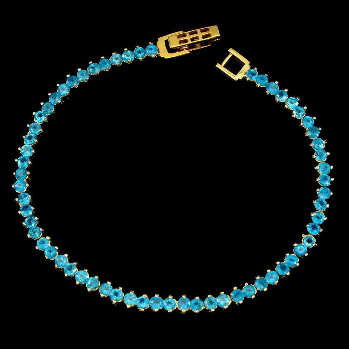 925 STERLING SILVER;PLATE-14K YELLOW GOLD;MAIN STONE-APATITE;TOTAL WEIGHT-8.82 GRAM (TOTAL WEIGHT OF SILVER + STONE)DIMENSION-* STONE 2.5 MM. * FACE BRACELET 171.0 X 4.0 MM.MAIN STONE SHAPE-ROUND CUT;MAIN STONE COLOR-TOP PARAIBA BLUE;CLARITY/GRADE-IF TO VVS;ORIGIN- BRAZIL;HARDNESS-5