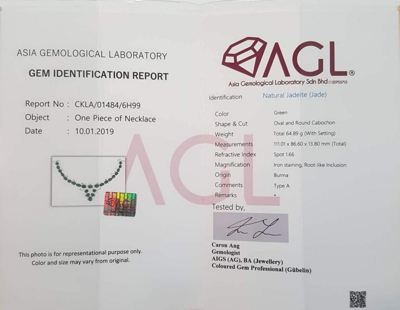 Natural Burma Jade/Jadite 64.89 grams (Total Necklace weight)....Type A Necklace.......sterling silver with 14k white Gold overlay.........Untreated Burma jade Necklace....completely untreated Jade ....Origin - Burma...AGL Certified