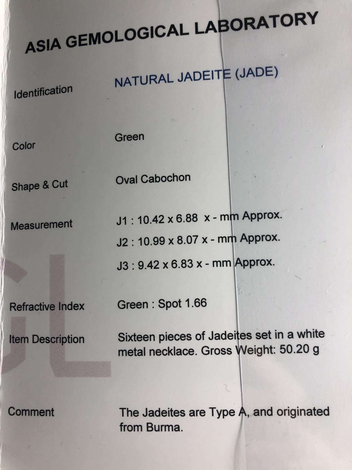 Natural Burma Jade/Jadite 50.26 grams (Total Necklace weight)....Type A Necklace.......sterling silver with 14k white Gold overlay.........Untreated Burma jade Necklace....completely untreated Jade ....Origin - Burma...GIA and AGL Certified