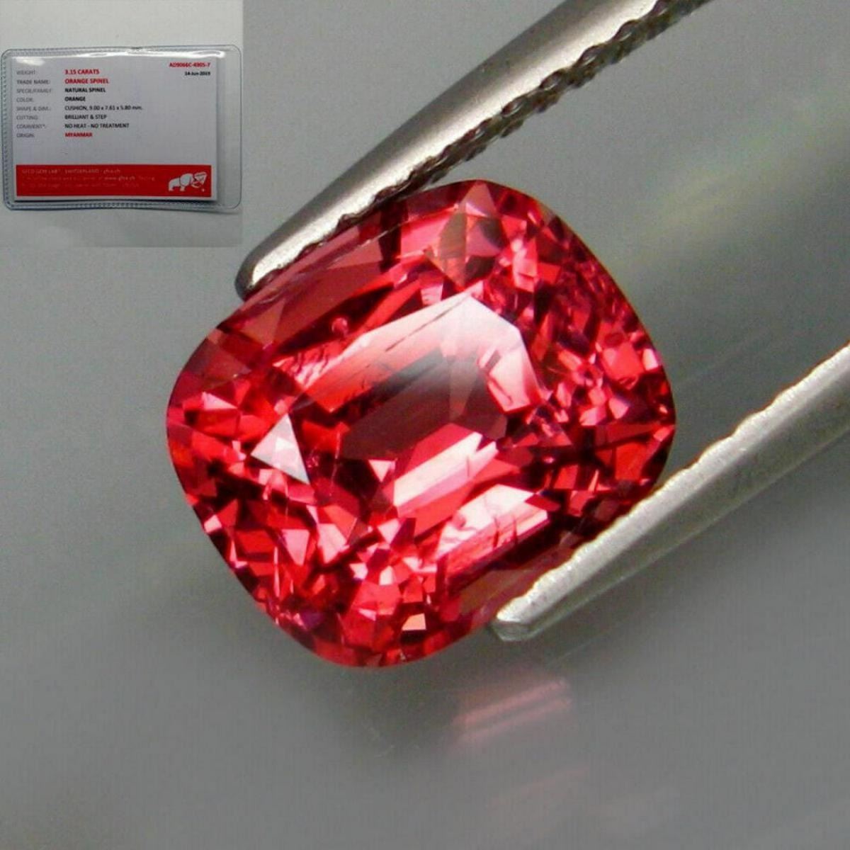 Spinel SHAPE Classic Cushion WEIGHT 3.15 Ct.SIZE 9 X 7.61 X 5.8 mm; QUANTITY 1 Piece COLOR Top Orange Pink; CLARITY VS; ORIGIN - Burma/ Myanmar; TREATMENT None HARDNESS 8