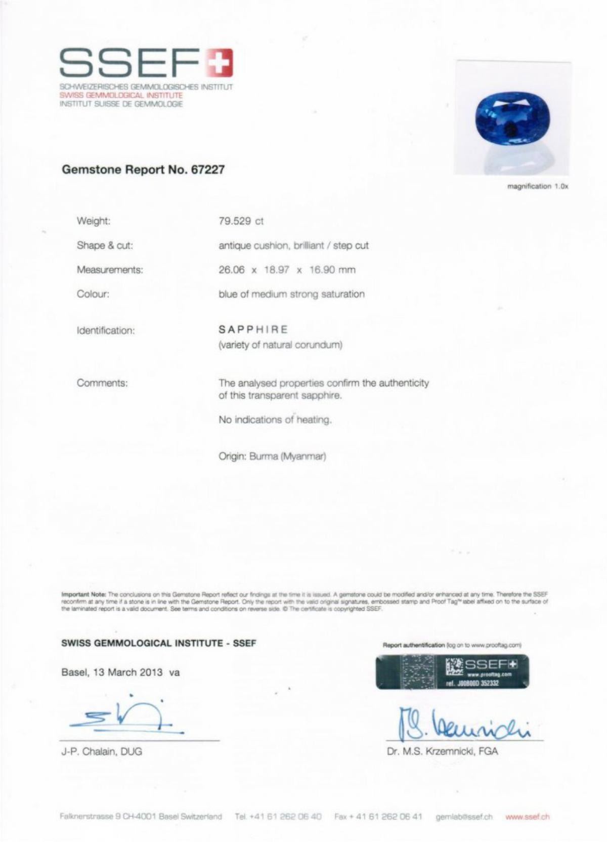 Natural Burma Sapphire 79.52 ct - Gubelin & Ssef certified; 100% natural earth mined Burma sapphire; AGL has written a special portofolio on this sapphire. please copy and paste these links to watch videos of this sapphire;