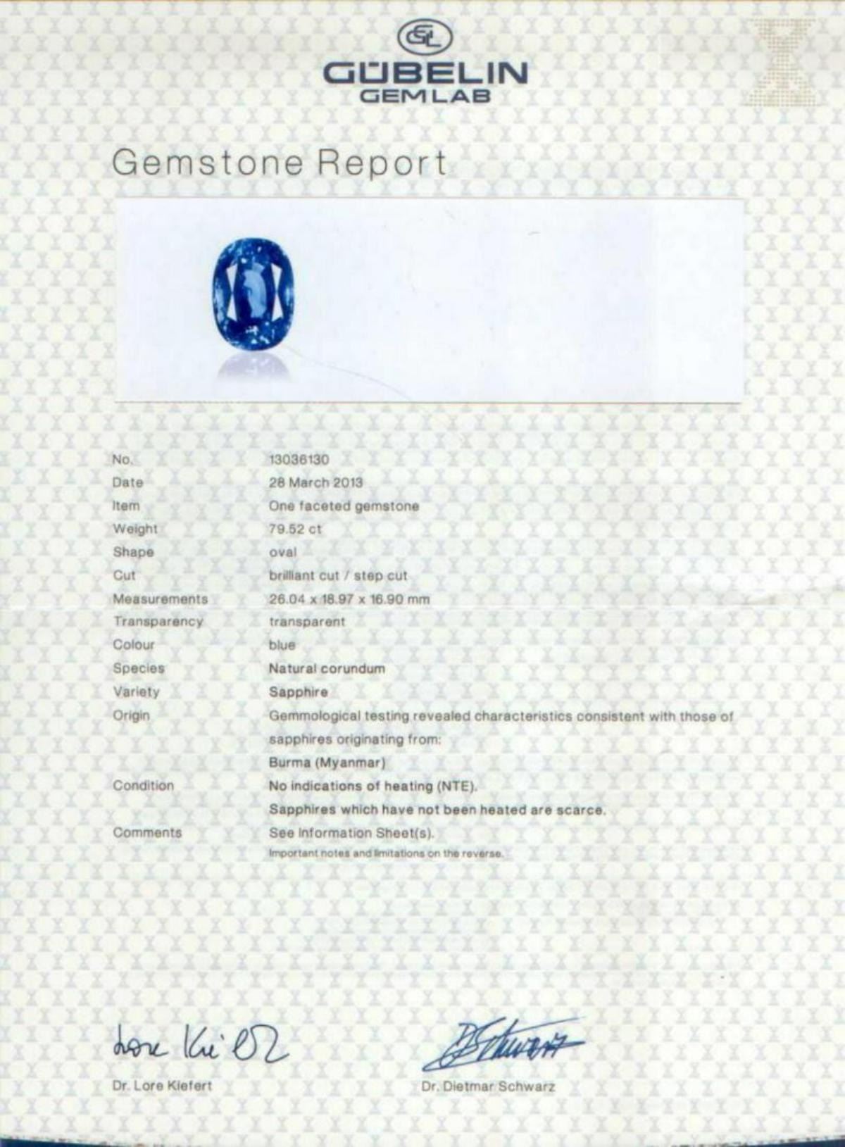 Natural Burma Sapphire 79.52 ct - Gubelin & Ssef certified; 100% natural earth mined Burma sapphire; AGL has written a special portofolio on this sapphire. please copy and paste these links to watch videos of this sapphire;