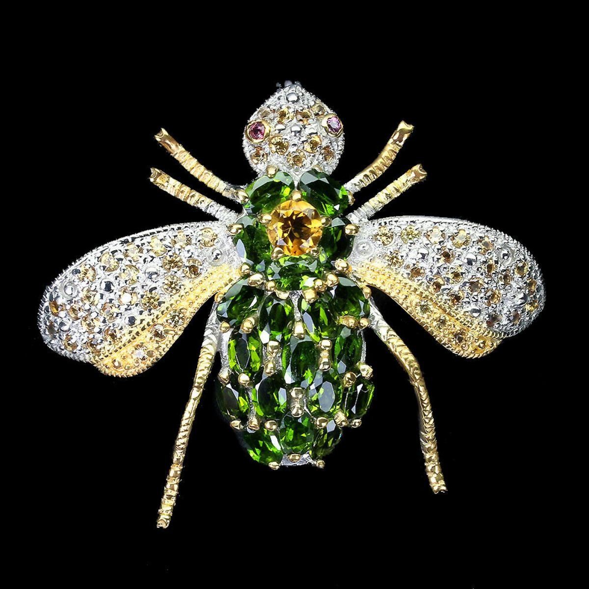 925 STERLING SILVER;PLATE-2-TONE WHITE & YELLOW 14K GOLD;MAIN STONE-CHROME DIOPSIDE;OTHER GEMS-CITRINE, RHODOLITE GARNET, SAPPHIRE;TOTAL WEIGHT-11.21 CT (TOTAL WEIGHT OF SILVER + STONE)DIMENSION-* STONE 1.5 TO 5.0 X 3.0 MM. * FACE BROOCH 48.0 X 35.0 MM.MAIN STONE SHAPE-OVAL CUT;MAIN STONE COLOR-TOP RICH GREEN;CLARITY/GRADE-IF TO VVS;TREATMENT-UNHEATED;ORIGIN-RUSSIA;HARDNESS-5.0 - 5.5;