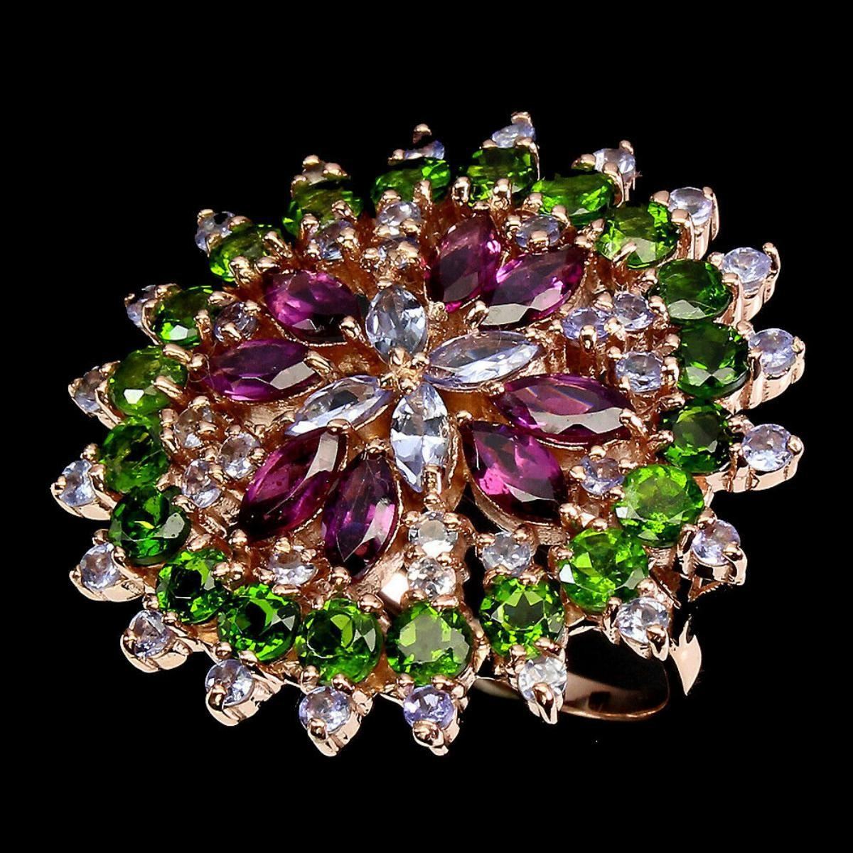 925 STERLING SILVER;PLATE-14K ROSE GOLD;RING SIZE(resizeable)7;MAIN STONE-RHODOLITE GARNET;OTHER GEMS-CHROME DIOPSIDE, TANZANITE;TOTAL WEIGHT-11.1 GRAM (TOTAL WEIGHT OF SILVER + STONE)DIMENSION-* STONE 2.0 TO 6.0 X 3.0 MM. * RING SIZE 7.0 * FACE RING- 31.0 X 21.0 MM.;MAIN STONE SHAPE-MARQUISE CUT;MAIN STONE COLOR-TOP RICH PINK RASPBERRY;CLARITY/GRADE-IF TO VVS;TREATMENT-UNHEATED;ORIGIN-AFRICA;HARDNESS-7.0 - 7.5;