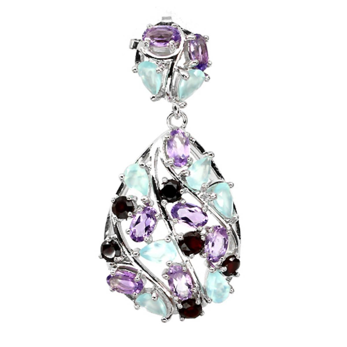 CHALCEDONY , AMETHYST MOZAMBIQUE GARNET (NATURAL) 14K WHITE GOLD PLATED 925 SILVER PENDANT;UNIT OF ITEM (S):1 PIECE;WEIGHT (CT.):27.34 CT. (total weight of silver + stone);DIMENSION:* STONE 3.0 TO 5.0 X 3.0 MM. * FACE PENDANT 39.0 X 19.0 MM.;SHAPE/CUT:PEAR, OVAL ROUND FACET;COLOR:TOP FANCY COLORS;CLARITY/GRADE:TRANSPARENT IF TO VVS;LUSTER:GORGEOUS;TREATMENT:HEATED TREATED UNHEATED;ORIGIN:AFRICA BRAZIL;HARDNESS:6.5 - 7.5-----------------------Blue Chalcedony is an excellent crystal for public speakers and those who speak for a living. Lawyers and political speakers might benefit from touching this stone to the tip of their tongue while listening to their opponents to enhance their counter arguments.Actors might rub it against their lips and throat, while singers may drink a glass of water in which Chalcedony has soaked for an hour before going on stage. Wearing this crystal around the neck helps overcome stage fright and the fear of public speaking. [Megemont, 50]As a stone of peace and peace-making, Blue Chalcedony encourages stillness and calm in the home for those at odds with one another, vying for their place in the pecking order. It is also beneficial for daily journeys to work, or stressful trips involving children. [Eason, 244]