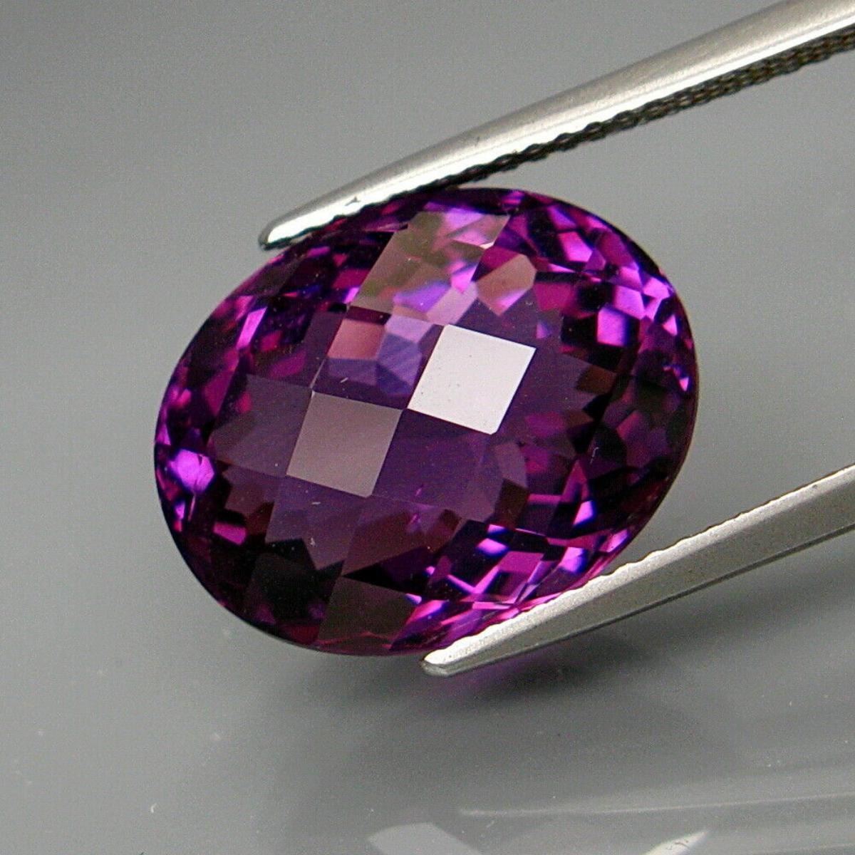 Amethyst SHAPE Oval Checkerboard WEIGHT 8.82 Ct.SIZE 15.1 X 11.9 X 8.8 mm QUANTITY 1 Piece COLOR Purple CLARITY VVS; LUSTER Superior ORIGIN Brazil; TREATMENT None HARDNESS 7