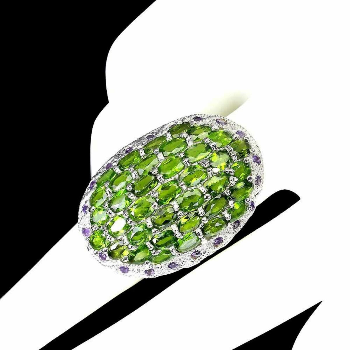 925 STERLING SILVER;PLATE14K WHITE GOLD;RING SIZE(resizeable)8;MAIN STONE-CHROME DIOPSIDE;OTHER GEMS-AMETHYST;TOTAL WEIGHT-12.35 GRAM (TOTAL WEIGHT OF SILVER + STONE)DIMENSION-* STONE 2.0 TO 5.0 X 3.0 MM. * RING SIZE 8.0 * FACE RING- 34.0 X 24.0 MM.;MAIN STONE SHAPE-OVAL CUT;MAIN STONE COLOR-TOP RICH GREEN;CLARITY/GRADE-IF TO VVS;TREATMENT-UNHEATED;ORIGIN-RUSSIA;HARDNESS-5.0 - 5.5;
