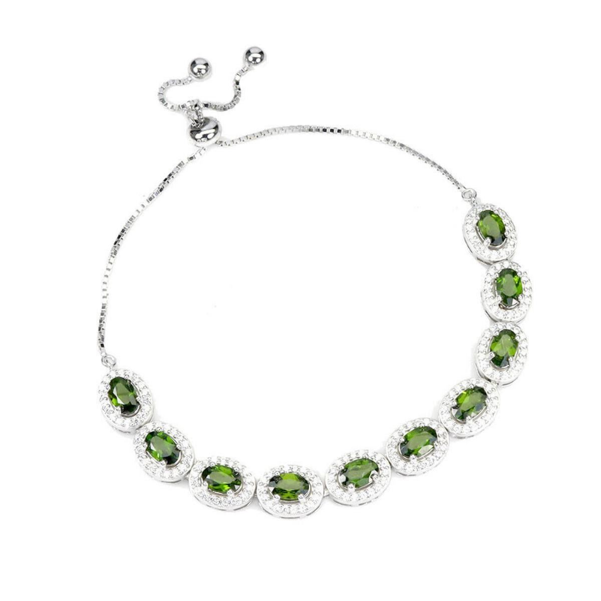 925 STERLING SILVER;PLATE-14K WHITE GOLD;LENGTH (INCHES)8;MAIN STONE-CHROME DIOPSIDE;TOTAL WEIGHT-10.85 GRAM (TOTAL WEIGHT OF SILVER + STONE)DIMENSION-* STONE 6.0 X 4.0 MM.;* TOTAL LENGTH- 8.0 INCHES.;* FACE BRACELET- 105.0 X 8.0 MM.;MAIN STONE SHAPE-OVAL CUT;MAIN STONE COLOR-GREEN;CLARITY/GRADE-IF TO VVS;TREATMENT-UNHEATED;ORIGIN-RUSSIA;HARDNESS-5;