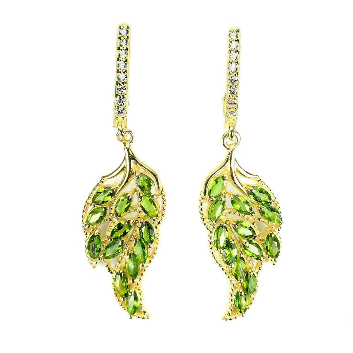 925 STERLING SILVER;PLATE-14K YELLOW GOLD;MAIN STONE-CHROME DIOPSIDE;TOTAL WEIGHT-4.92 GRAM (TOTAL WEIGHT OF SILVER + STONE)DIMENSION-* STONE 4.0 X 2.0 MM.;* FACE EARRINGS -43.0 X 12.0 MM.;MAIN STONE SHAPE-MARQUISE CUT;MAIN STONE COLOR-TOP RICH GREEN;CLARITY/GRADE-IF TO VVS;TREATMENT-UNHEATED;ORIGIN-RUSSIA;HARDNESS-5.0 - 5.5;