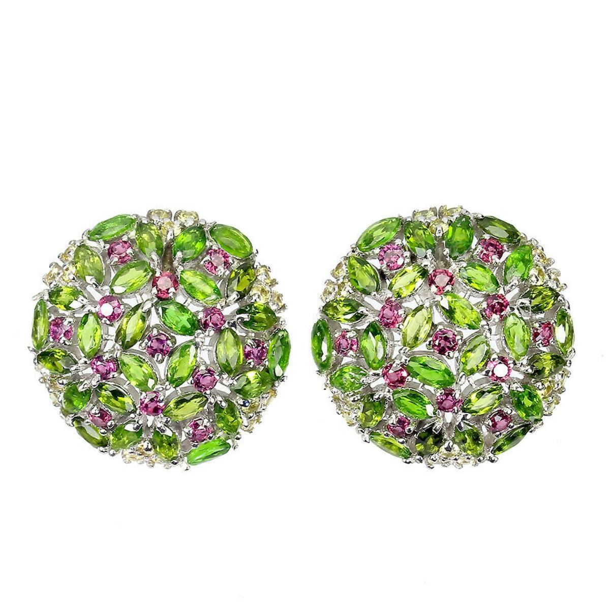 925 STERLING SILVER;PLATE-14K WHITE GOLD;MAIN STONE-CHROME DIOPSIDE;OTHER GEMS-RHODOLITE GARNET, SAPPHIRE DIAMOND CUT;TOTAL WEIGHT-7.29 GRAM (TOTAL WEIGHT OF SILVER + STONE)DIMENSION-* STONE 1.5 TO 4.0 X 2.0 MM. * FACE EARRINGS 21.0 X 21.0 MM.;MAIN STONE SHAPE-MARQUISE CUT;MAIN STONE COLOR- GREEN;CLARITY/GRADE-IF TO VVS;TREATMENT-UNHEATED;ORIGIN-RUSSIA;HARDNESS-5.0 - 5.5;