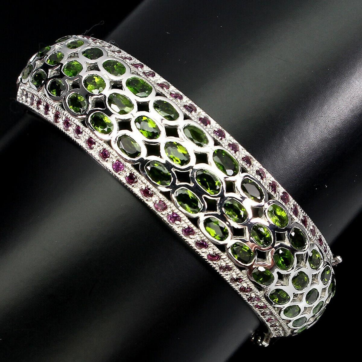 925 STERLING SILVER;;PLATE-14K WHITE GOLD-MAIN STONE-CHROME DIOPSIDE;OTHER GEMS-RHODOLITE GARNET;TOTAL WEIGHT-48.65 GRAM (TOTAL WEIGHT OF SILVER + STONE)DIMENSION-* STONE 2.0 TO 5.0 X 3.0 MM. * DIAMETER 2.2 X 2.1 INCHES. * FACE BANGLE 70.0 X 17.0 MM.;MAIN STONE SHAPE-OVAL CUT;MAIN STONE COLOR-TOP RICH GREEN;CLARITY/GRADE-IF TO VVS;TREATMENTUNHEATED;ORIGIN-RUSSIA;HARDNESS-5.0 - 5.5;