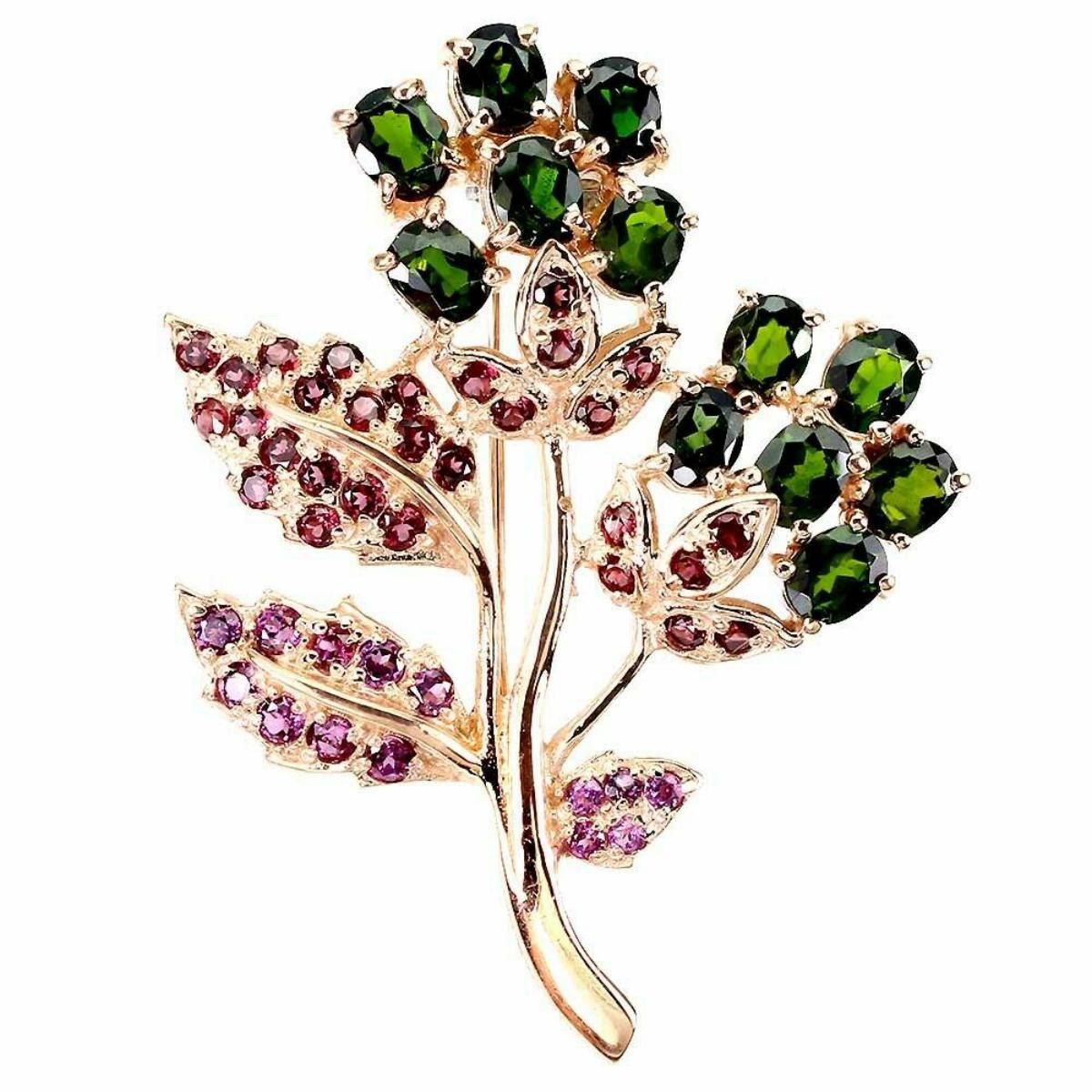 925 STERLING SILVER;PLATE-14K ROSE GOLD;MAIN STONE-CHROME DIOPSIDE;OTHER GEMS-RHODOLITE GARNET;TOTAL WEIGHT-12.51 GRAM (TOTAL WEIGHT OF SILVER + STONE)DIMENSION* STONE 2.0 TO 5.0 X 4.0 MM. * FACE BROOCH 48.0 X 38.0 MM.;MAIN STONE SHAPE-OVAL CUT;MAIN STONE COLOR-TOP RICH GREEN;CLARITY/GRADE-IF TO VVS;TREATMENT-UNHEATED;ORIGIN-RUSSIA;HARDNESS-5.0 - 5.5;