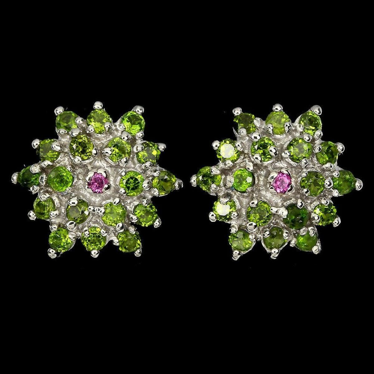925 STERLING SILVER;PLATE-14K WHITE GOLD;MAIN STONE-CHROME DIOPSIDE;OTHER GEMS-RHODOLITE GARNET;TOTAL WEIGHT-5.46 GRAM (TOTAL WEIGHT OF SILVER + STONE)DIMENSION-* STONE 2.0 TO 2.5 MM. * FACE EARRINGS 17.0 X 15.0 MM.MAIN STONE SHAPE-ROUND CUT;MAIN STONE COLOR-TOP RICH GREEN;CLARITY/GRADE-IF TO VVS;LUSTER-GORGEOUS;TREATMENT-UNHEATED;ORIGIN-RUSSIA;HARDNESS-5.0 - 5.5;