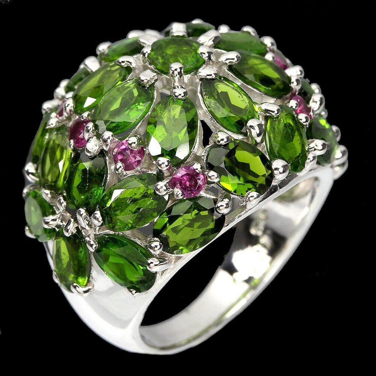 925 STERLING SILVER;PLATE...14K WHITE GOLD;RING SIZE-9(resizeable);MAIN STONE-CHROME DIOPSIDE;OTHER GEMS-RHODOLITE GARNET;TOTAL WEIGHT-13.23 GRAM (TOTAL WEIGHT OF SILVER + STONE)DIMENSION-* STONE 2.5 TO 6.0 X 4.0 MM. * RING SIZE 9.0 * FACE RING- 28.0 X 24.0 MM.;MAIN STONE SHAPE-OVAL CUT;MAIN STONE COLOR-TOP RICH GREEN;CLARITY/GRADE-IF TO VVS;TREATMENT-UNHEATED;ORIGIN-RUSSIA;