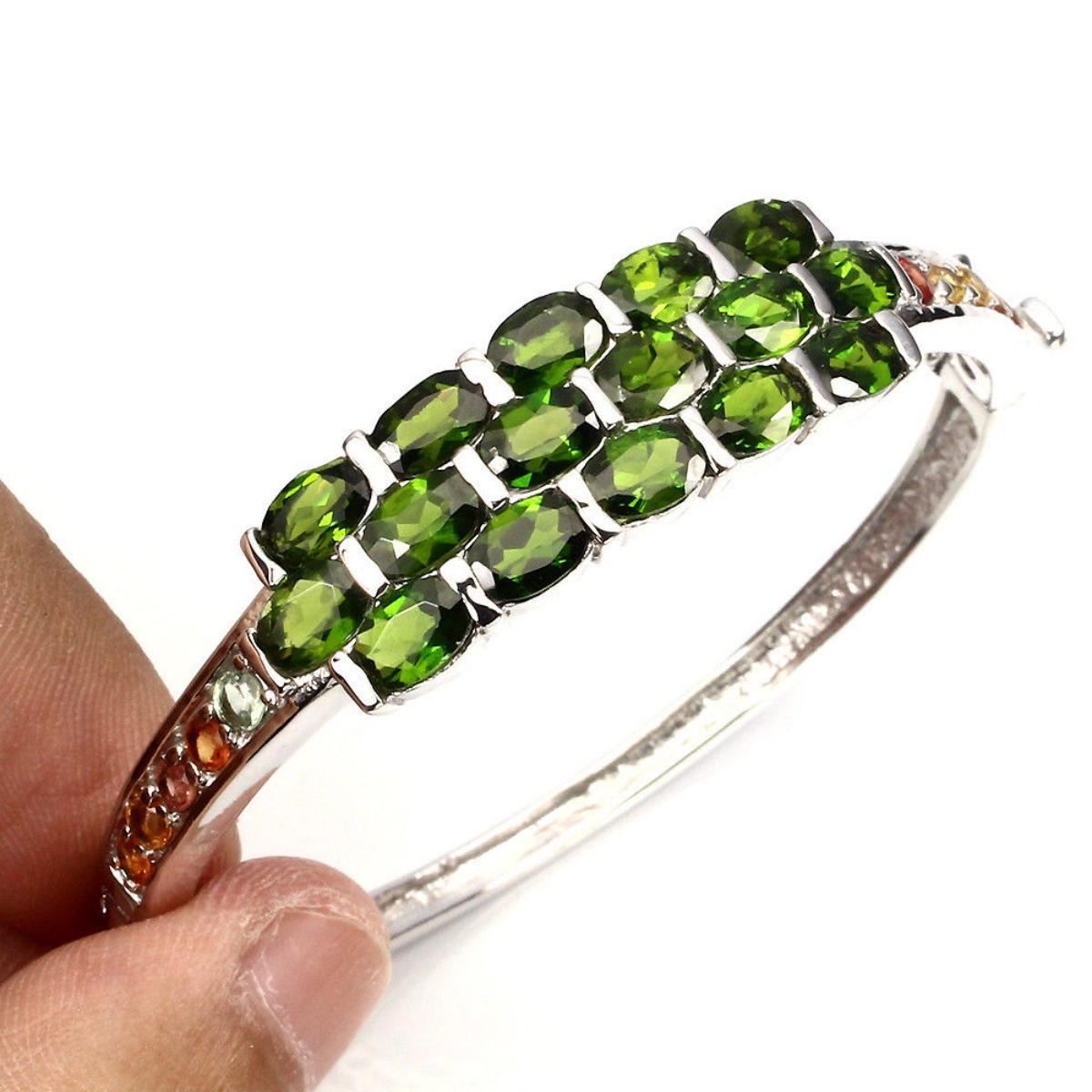 925 STERLING SILVER; PLATE ....14K WHITE GOLD.; LENGTH (INCHES) - 2 inch MAIN STONE -CHROME DIOPSIDE- OTHER GEMS -SAPPHIRE- TOTAL WEIGHT 77.70 CT (TOTAL WEIGHT OF SILVER + STONE) DIMENSION * STONE 2.5 TO 6.0 X 4.0 MM. * DIAMETER 2.0 X 1.9 INCHES. * FACE BANGLE 56.0 X 12.0 MM. MAIN STONE SHAPE OVAL CUT MAIN STONE COLOR TOP RICH GREEN CLARITY/GRADE IF TO VVS LUSTER PRECIOUS TREATMENT UNHEATED ORIGIN RUSSIA HARDNESS 5.0 - 9.0