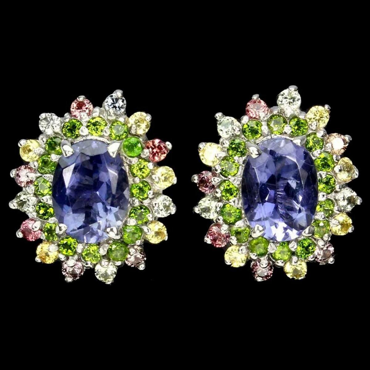 925 STERLING SILVER;PLATE-14K WHITE GOLD;MAIN STONE-IOLITE;OTHER GEMS-CHROME DIOPSIDE, SAPPHIRE;TOTAL WEIGHT-4.21 CT (TOTAL WEIGHT OF SILVER + STONE)DIMENSION-* STONE 1.0 TO 8.0 X 6.0 MM. * FACE EARRINGS 15.0 X 13.0 MM.MAIN STONE SHAPE-OVAL CUT;MAIN STONE COLOR-TOP RICH BLUE VIOLET;CLARITY/GRADE-IF TO VVS;TREATMENT-UNHEATED;ORIGIN-AFRICA;HARDNESS-7