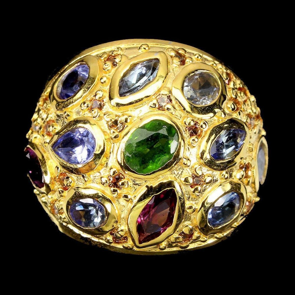 925 STERLING SILVER;PLATE-14K YELLOW GOLD;RING SIZE/(resizeable)7;MAIN STONE-CHROME DIOPSIDE;OTHER GEMS-RHODOLITE GARNET, SAPPHIRE, TANZANITE;TOTAL WEIGHT-2.79 GRAM (TOTAL WEIGHT OF SILVER + STONE)DIMENSION-* STONE 1.5 TO 6.0 X 3.0 MM. * RING SIZE 7.0 * FACE RING- 21.0 X 19.0 MM.;MAIN STONE SHAPE-OVAL CUT;MAIN STONE COLOR-TOP RICH GREEN;CLARITY/GRADE-IF TO VVS;TREATMENT-UNHEATED;ORIGIN-RUSSIA;HARDNESS-5.0 - 5.5;