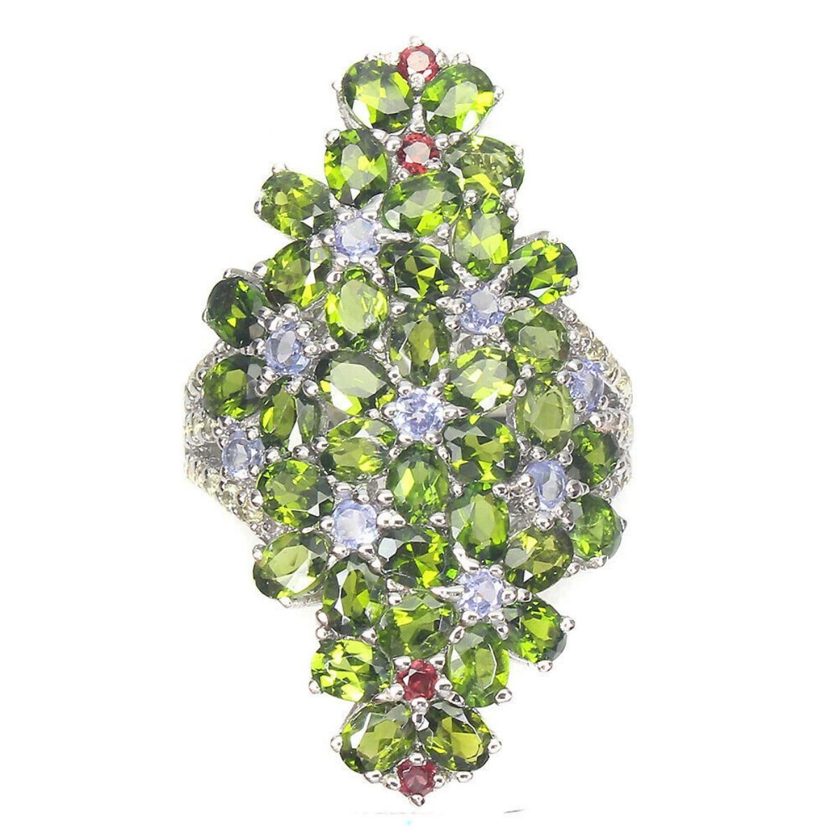 925 STERLING SILVER;PLATE-14K WHITE GOLD;RING SIZE/resizeable-8;MAIN STONE-CHROME DIOPSIDE;OTHER GEMS-SAPPHIRE, TANZANITE;TOTAL WEIGHT-7.98 GRAM (TOTAL WEIGHT OF SILVER + STONE)DIMENSION-* STONE 1.5 TO 4.0 X 3.0 MM. * RING SIZE 8.0 * FACE RIN-G 38.0 X 23.0 MM.;MAIN STONE SHAPE-OVAL CUT;MAIN STONE COLOR-TOP RICH GREEN;CLARITY/GRADE-IF TO VVS;TREATMENT-UNHEATED;ORIGIN-RUSSIA;HARDNESS-5.0 - 5.5;