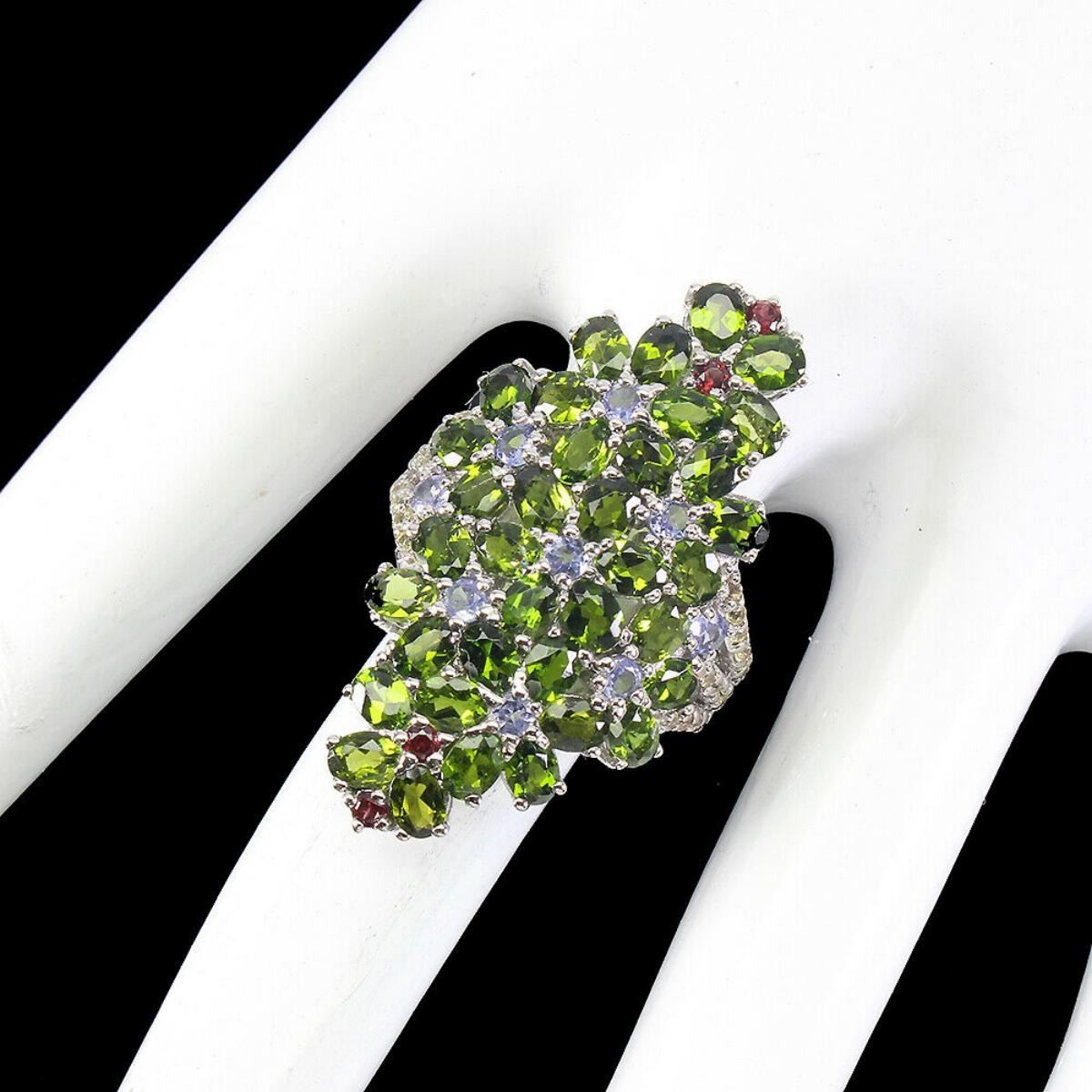 925 STERLING SILVER;PLATE-14K WHITE GOLD;RING SIZE/resizeable-8;MAIN STONE-CHROME DIOPSIDE;OTHER GEMS-SAPPHIRE, TANZANITE;TOTAL WEIGHT-7.98 GRAM (TOTAL WEIGHT OF SILVER + STONE)DIMENSION-* STONE 1.5 TO 4.0 X 3.0 MM. * RING SIZE 8.0 * FACE RIN-G 38.0 X 23.0 MM.;MAIN STONE SHAPE-OVAL CUT;MAIN STONE COLOR-TOP RICH GREEN;CLARITY/GRADE-IF TO VVS;TREATMENT-UNHEATED;ORIGIN-RUSSIA;HARDNESS-5.0 - 5.5;
