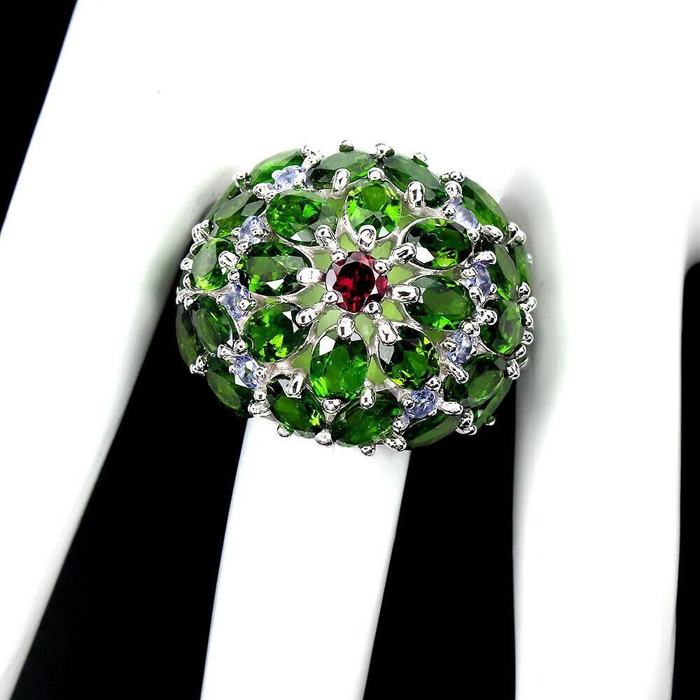 925 STERLING SILVER;PLATE-14K WHITE GOLD;RING SIZE(resizeable)8;MAIN STONE-CHROME DIOPSIDE;OTHER GEMS-RHODOLITE GARNET, TANZANITE;TOTAL WEIGHT-13.35 GRAM (TOTAL WEIGHT OF SILVER + STONE)DIMENSION-* STONE 2.5 TO 6.0 X 4.0 MM. * RING SIZE 8.0 * FACE RING -29.0 X 24.0 MM.;MAIN STONE SHAPE-ROUND CUT;MAIN STONE COLOR-TOP RICH GREEN;CLARITY/GRADE-IF TO VVS;TREATMENT-UNHEATED;ORIGIN-RUSSIA;HARDNESS-5;