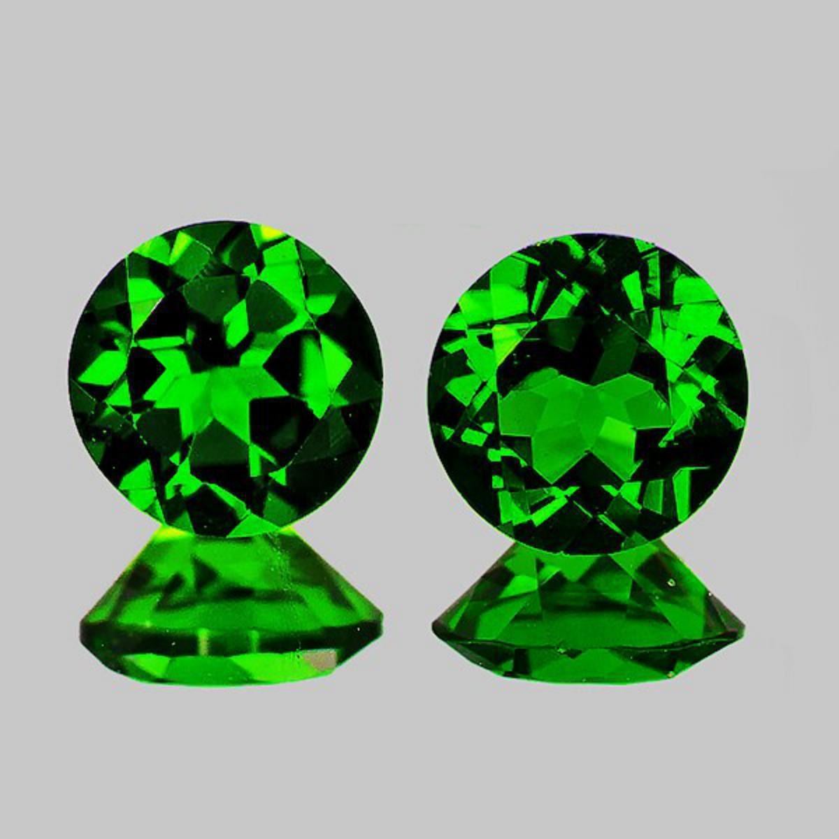 Natural DiopsideSIZE ( L x W x D ) : 4.00 mm;COLOR : Chrome Green Excellent Color SHAPE : Round;QUANTITY : 2 pieces (Perfectly Matched Set);LUSTER : Excellent CLARITY : Flawless-VVS1 ;HIGH QUALITY;HARDNESS : 7;ORIGIN : Russia; TREATMENT : 100% Natural Unheated;