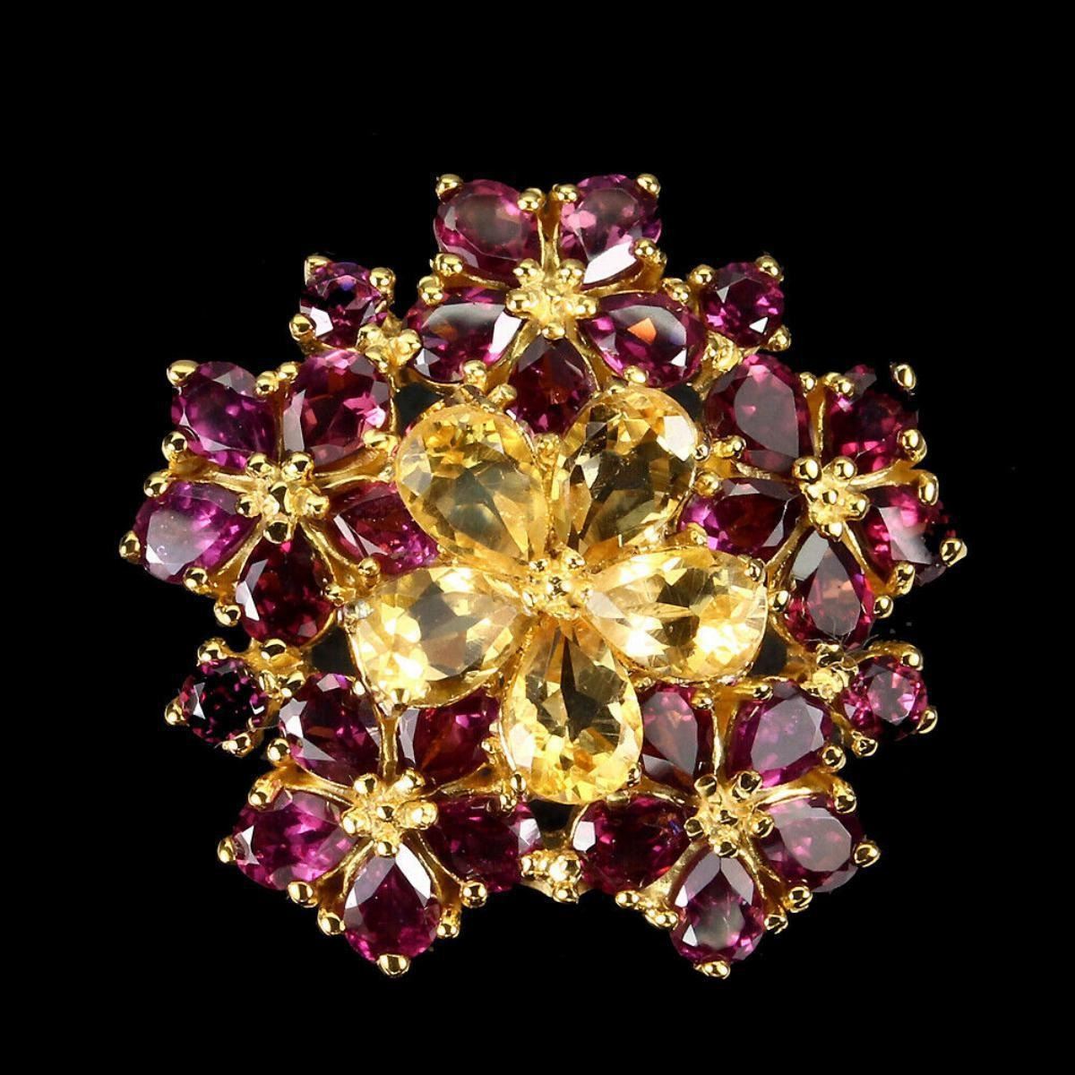 925 STERLING SILVER;PLATE-14K YELLOW GOLD;RING SIZE-8.5(resizeable);MAIN STONE-CITRINE;OTHER GEMS-RHODOLITE GARNET;TOTAL WEIGHT-7.35 GRAM (TOTAL WEIGHT OF SILVER + STONE)DIMENSION-* STONE 3.0 TO 6.0 X 4.0 MM. * RING SIZE 8.5 * FACE RING 27.0 X 25.0 MM.;MAIN STONE SHAPE-PEAR CUT;MAIN STONE COLOR-TOP RICH YELLOW;CLARITY/GRADE-IF TO VVS;;TREATMENT-UNHEATED;ORIGIN-AFRICA;HARDNESS-7;