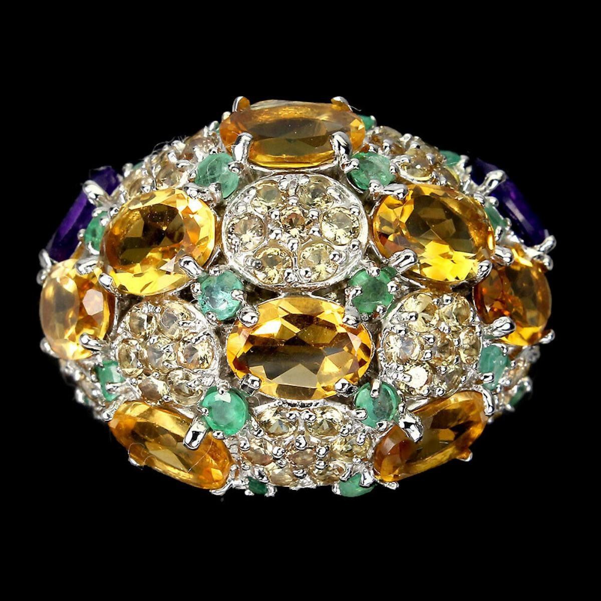 925 STERLING SILVER;PLATE-14K WHITE GOLD;RING SIZE-8(RESIZABLE);MAIN STONE-CITRINE;OTHER GEMS-AMETHYST, EMERALD, SAPPHIRE;TOTAL WEIGHT-9.47 GRAM (TOTAL WEIGHT OF SILVER + STONE);DIMENSION-* STONE 1.5 TO 7.0 X 5.0 MM. * RING SIZE 8.0 * FACE RING 26.0 X 20.0 MM.;MAIN STONE SHAPE-OVAL; MAIN STONE COLOR- GOLDEN YELLOW;CLARITY/GRADE-IF ;TREATMENT-UNHEATED;ORIGIN-BRAZIL;HARDNESS-7;