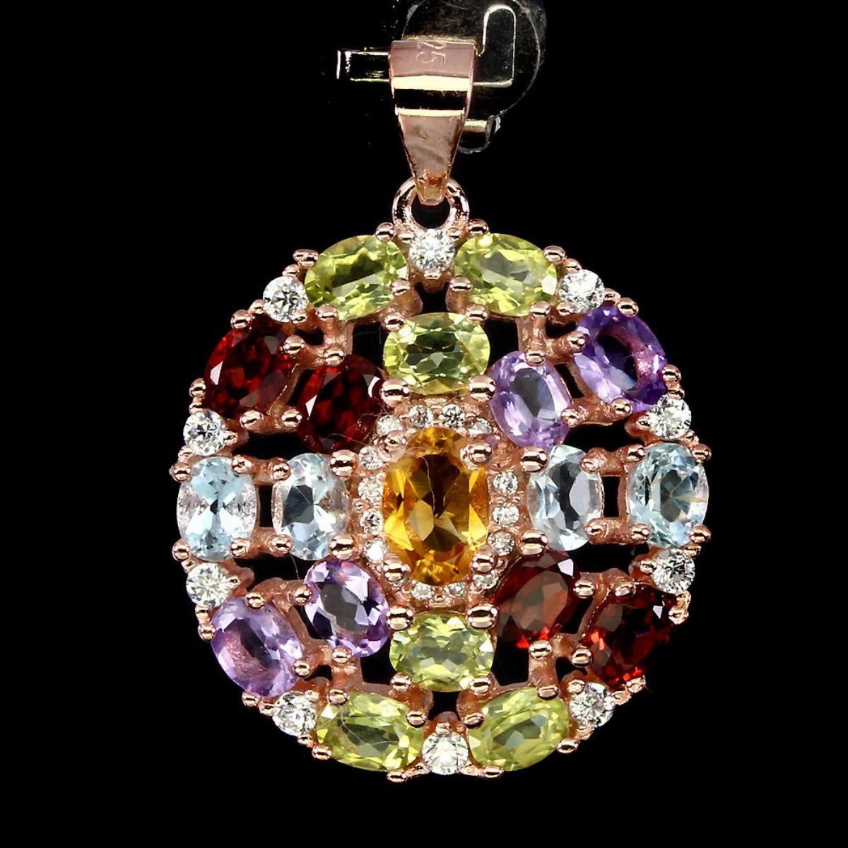 925 STERLING SILVER;PLATE14K ROSE GOLD;MAIN STONE....CITRINE;OTHER GEMS...AMETHYST,CUBIC ZIRCONIA,MOZAMBIQUE GARNET,PERIDOT,SKY BLUE TOPAZ;TOTAL WEIGHT20.75 CT (TOTAL WEIGHT OF SILVER + STONE)DIMENSION* STONE 4.0 X 3.0 TO 6.0 X 4.0 MM. * CZ 1.0 TO 2.0 MM. * FACE PENDANT 29.0 X 21.0 MM.MAIN STONE SHAPEOVAL CUTMAIN STONE COLORMULTI-COLORCLARITY/GRADEIF TO VVS;LUSTERDELIGHTFUL;TREATMENTUNHEATED;ORIGINBRAZIL