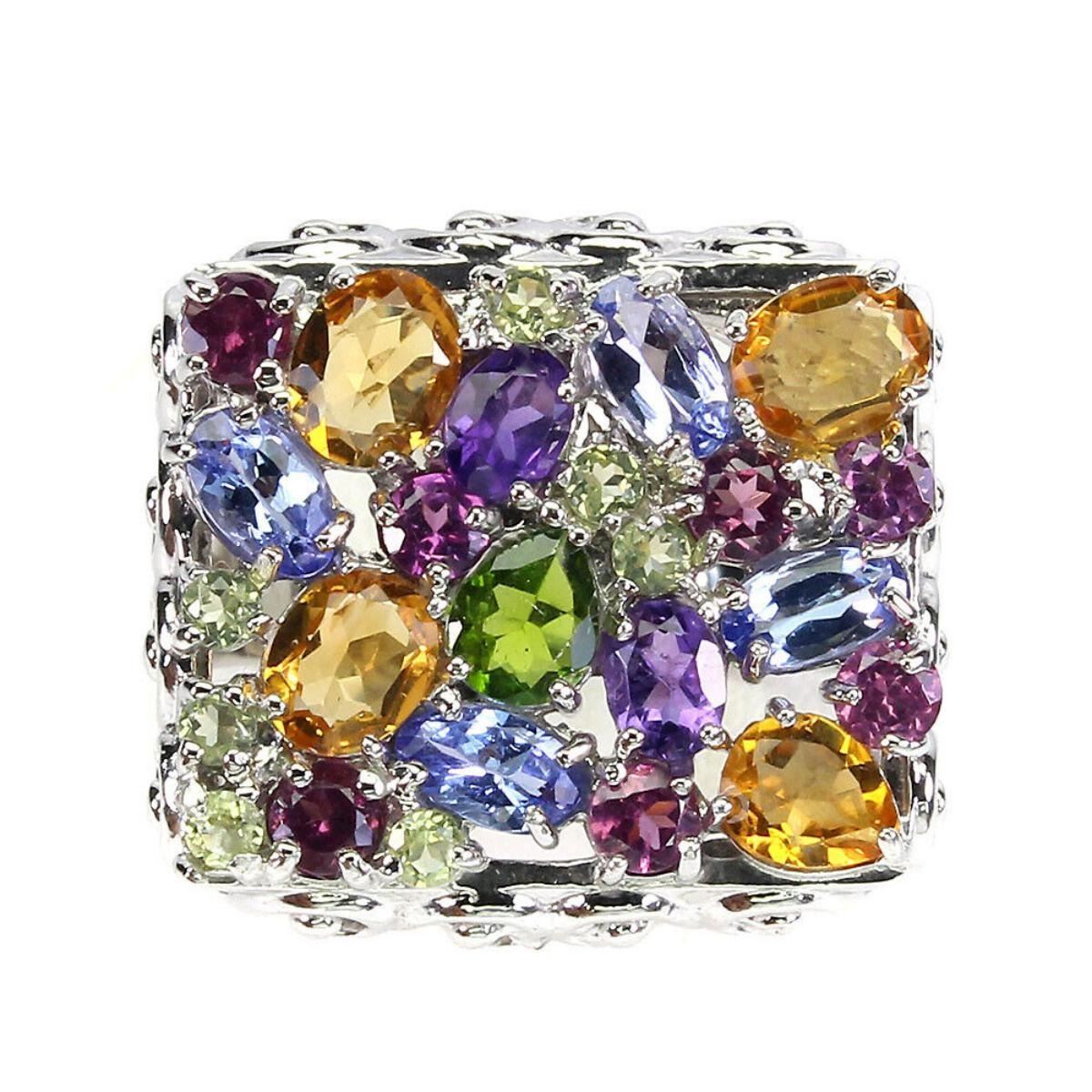 925 STERLING SILVER;PLATE-14K WHITE GOLD;RING SIZE-8.5(RESIZABLE);MAIN STONE-CITRINE;OTHER GEMS-AMETHYST, PERIDOT, RHODOLITE GARNET, TANZANITE;TOTAL WEIGHT-9.18 GRAM (TOTAL WEIGHT OF SILVER + STONE);DIMENSION-* STONE 2.0 TO 5.0 X 4.0 MM.* RING SIZE 8.5* FACE RING 21.0 X 19.0 MM.;MAIN STONE SHAPE-OVAL ;MAIN STONE COLOR-YELLOW;CLARITY/GRADE-IF TO VVS;TREATMENT-UNHEATED;ORIGIN-BRAZIL;HARDNESS-7;