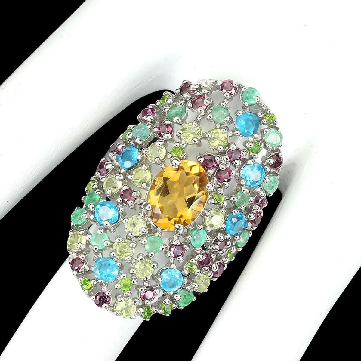 925 STERLING SILVER;PLATE-14K WHITE GOLD;RING SIZE-9(RESIZABLE);MAIN STONE-CITRINE;OTHER GEMS-APATITE, CHROME DIOPSIDE, EMERALD, PERIDOT, RHODOLITE GARNET;TOTAL WEIGHT-8.04 GRAM (TOTAL WEIGHT OF SILVER + STONE);DIMENSION-* STONE 1.5 TO 9.0 X 7.0 MM.* RING 7.0 SIZE* FACE RING 33.0 X 21.0 MM.;MAIN STONE SHAPE-OVAL; MAIN STONE COLOR-YELLOW;CLARITY/GRADE-IF TO VVS;TREATMENT-UNHEATED;ORIGIN-BRAZIL;HARDNESS-7;