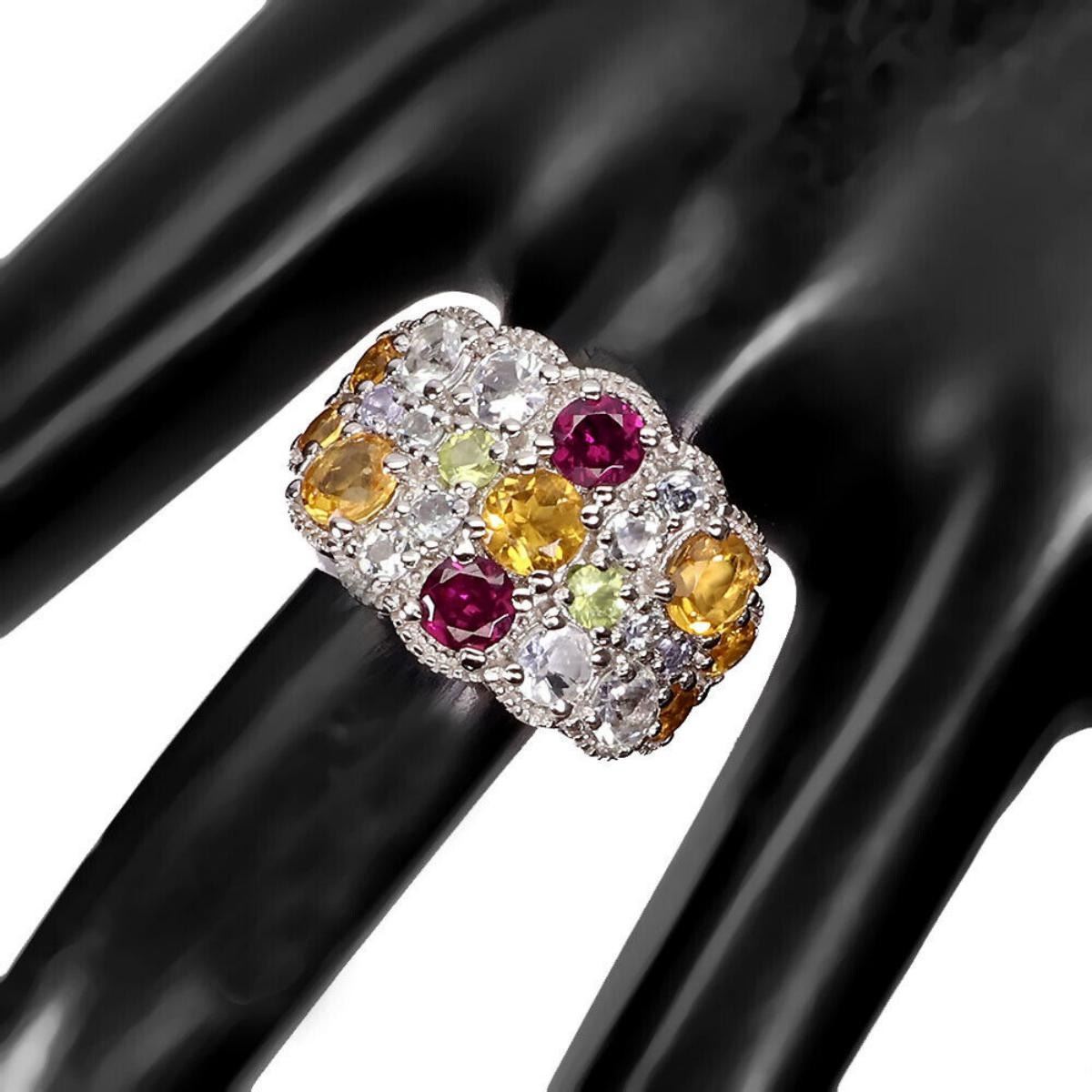 925 STERLING SILVER;PLATE-14K WHITE GOLD;RING SIZE-8(RESIZABLE);MAIN STONE-CITRINE;OTHER GEMS-AQUAMARINE, PERIDOT, RHODOLITE GARNET;TOTAL WEIGHT-6.59 GRAM (TOTAL WEIGHT OF SILVER + STONE);DIMENSION-* STONE 2.0 TO 5.0 MM * RING SIZE 8.0* FACE RING 25.0 X 17.0 MM.;MAIN STONE SHAPE-ROUND;MAIN STONE COLOR- YELLOW;CLARITY/GRADE-IF TO VVS;TREATMENT-UNHEATED;ORIGIN-BRAZIL;HARDNESS-7;