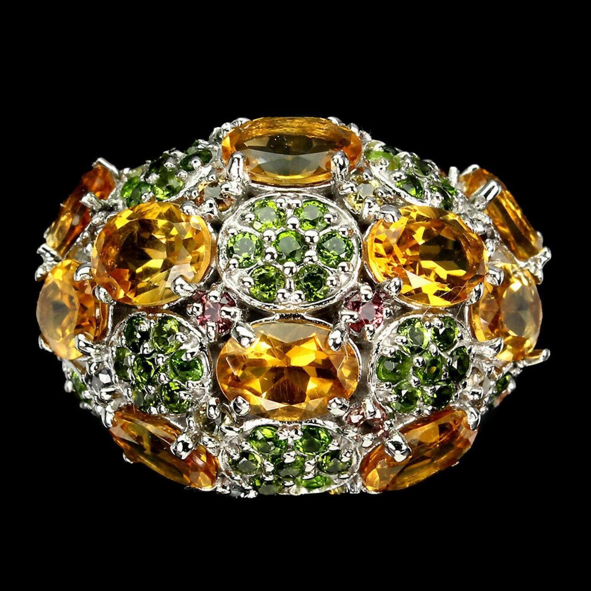 925 STERLING SILVER;PLATE-14K WHITE GOLD;RING SIZE(resizeable)8;MAIN STONE-CITRINE;OTHER GEMS-CHROME DIOPSIDE, RHODOLITE GARNET;TOTAL WEIGHT-9.82 GRAM (TOTAL WEIGHT OF SILVER + STONE)DIMENSION-* STONE 1.5 TO 7.0 X 5.0 MM. * RING SIZE 8.0 * FACE RING- 25.0 X 19.0 MM.;MAIN STONE SHAPE-OVAL CUT;MAIN STONE COLOR-TOP RICH YELLOW;CLARITY/GRADE-IF TO VVS;TREATMENT-UNHEATED;ORIGIN-BRAZIL;HARDNESS-7;
