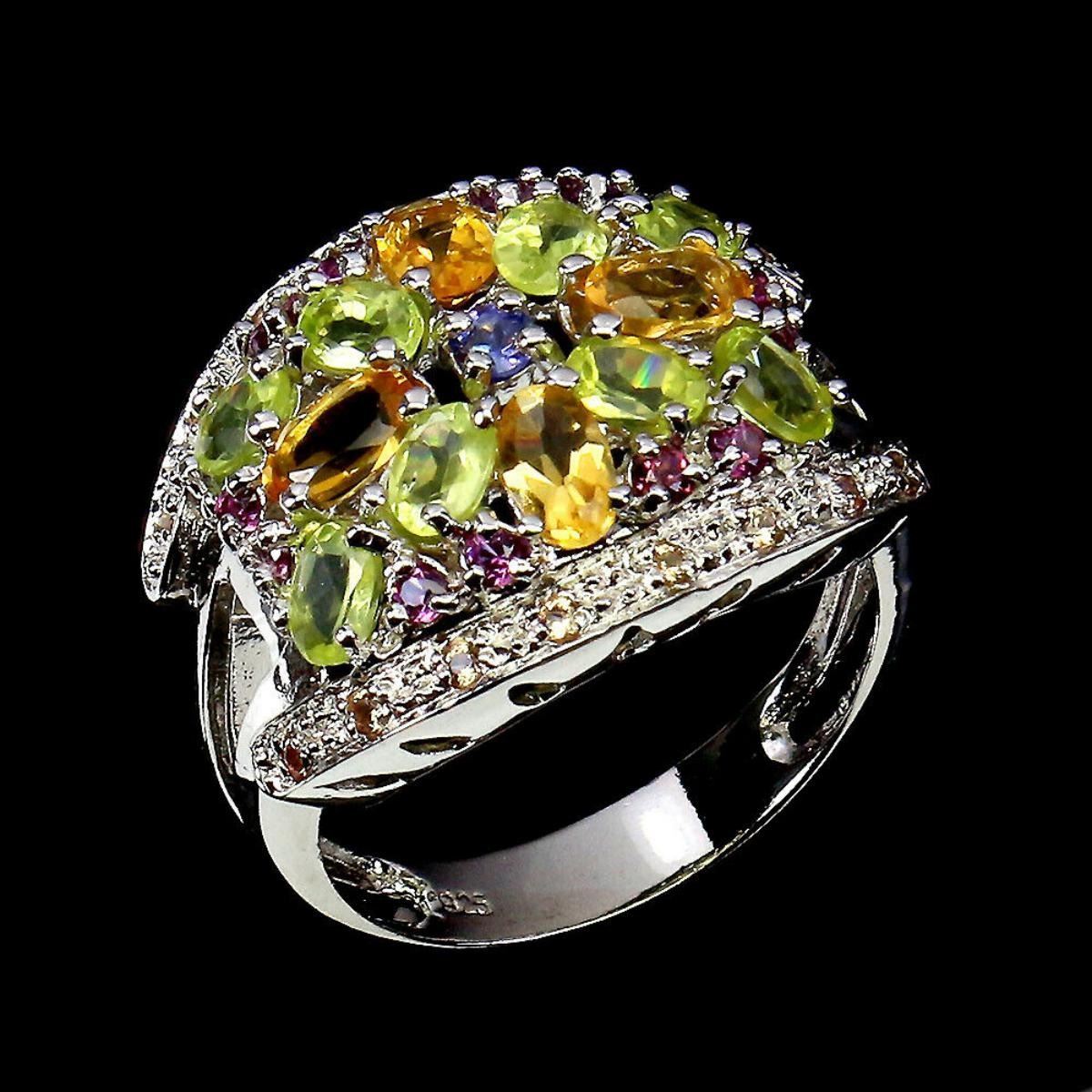 925 STERLING SILVER;PLATE-14K WHITE GOLD;RING SIZE-8(RESIZABLE);MAIN STONE-CITRINE;OTHER GEMS-PERIDOT, RHODOLITE GARNET, SAPPHIRE, TANZANITE;TOTAL WEIGHT-4.98 GRAM (TOTAL WEIGHT OF SILVER + STONE);DIMENSION-* STONE 1.0 TO 5.0 X 3.0 MM.* RING SIZE 8.0* FACE RING 22.0 X 18.0 MM.;MAIN STONE SHAPE-OVAL ;MAIN STONE COLOR-YELLOW;CLARITY/GRADE-IF TO VVS;TREATMENT-UNHEATED;ORIGIN-BRAZIL;HARDNESS-7;