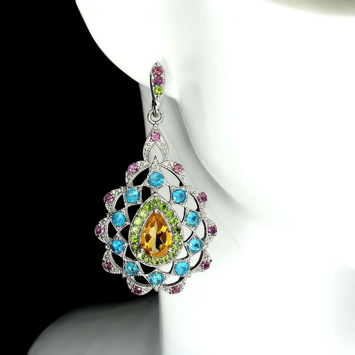 925 STERLING SILVER; PLATE- 14K WHITE GOLD; MAIN STONE- CITRINE OTHER GEMS- APATITE, CHROME DIOPSIDE, RHODOLITE GARNET; TOTAL WEIGHT- 9.09 GRAM (TOTAL WEIGHT OF SILVER + STONE); DIMENSION- * STONE 1.5 TO 9.0 X 6.0 MM.* FACE EARRINGS 45.0 X 23.0 MM.; MAIN STONE SHAPE- PEAR; MAIN STONE COLOR- YELLOW; CLARITY/GRADE- IF TO VVS; TREATMENT- UNHEATED; ORIGIN- BRAZIL; HARDNESS- 7;