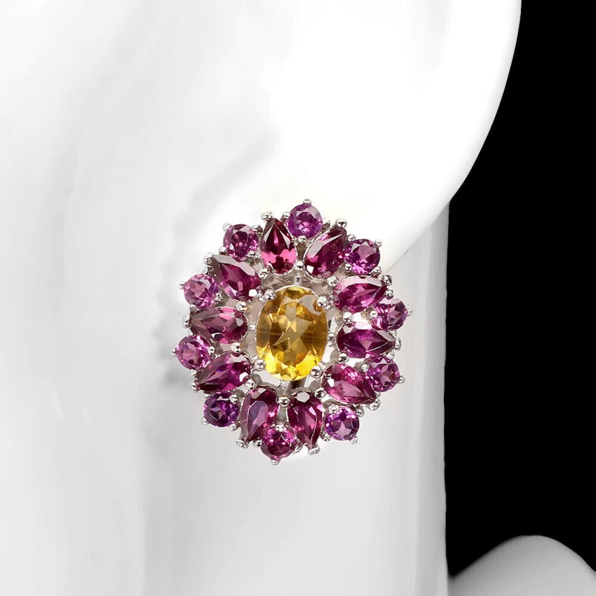 925 STERLING SILVER;PLATE-14K WHITE GOLD;MAIN STONE-CITRINE;OTHER GEMS-RHODOLITE GARNET;TOTAL WEIGHT-9.5 GRAM (TOTAL WEIGHT OF SILVER + STONE);DIMENSION-* STONE 3.0 TO 8.0 X 6.0 MM. * FACE EARRINGS 23.0 X 20.0 MM.;MAIN STONE SHAPE-OVAL; MAIN STONE COLOR - YELLOW;CLARITY/GRADE-IF TO VVS;TREATMENT-UNHEATED;ORIGIN-BRAZIL;HARDNESS-7;