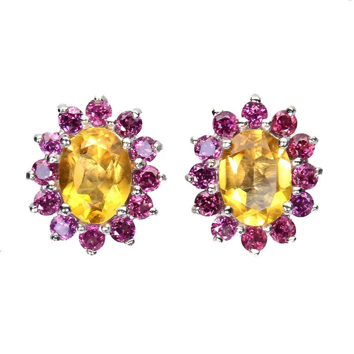 925 STERLING SILVER;PLATE-14K WHITE GOLD;MAIN STONE-CITRINE;OTHER GEMS-RHODOLITE GARNET;TOTAL WEIGHT-3.86 GRAM (TOTAL WEIGHT OF SILVER + STONE);DIMENSION- * STONE 2.5 TO 8.0 X 6.0 MM.* FACE EARRINGS 14.0 X 12.0 MM.;MAIN STONE SHAPE-OVAL;MAIN STONE COLOR - YELLOWCLARITY/GRADE-IF TO VVS;TREATMENT-UNHEATED;ORIGIN-BRAZIL;HARDNESS-7;