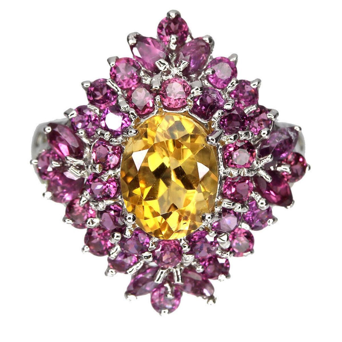 925 STERLING SILVER;PLATE-14K WHITE GOLD;RING SIZE-7.5(RESIZABLE);MAIN STONE-CITRINE;OTHER GEMS-RHODOLITE GARNET;TOTAL WEIGHT-5.29 GRAM (TOTAL WEIGHT OF SILVER + STONE);DIMENSION-* STONE 1.5 TO 9.0 X 7.0 MM.* RING SIZE 7.5* FACE RING 23.0 X 21.0 MM.;MAIN STONE SHAPE-OVAL; MAIN STONE COLOR-YELLOW;CLARITY/GRADE-IF TO VVS;TREATMENT-UNHEATED;ORIGIN-BRAZIL;HARDNESS-7;