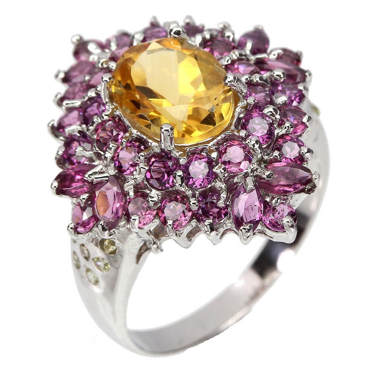 925 STERLING SILVER;PLATE-14K WHITE GOLD;RING SIZE-7.5(RESIZABLE);MAIN STONE-CITRINE;OTHER GEMS-RHODOLITE GARNET;TOTAL WEIGHT-5.29 GRAM (TOTAL WEIGHT OF SILVER + STONE);DIMENSION-* STONE 1.5 TO 9.0 X 7.0 MM.* RING SIZE 7.5* FACE RING 23.0 X 21.0 MM.;MAIN STONE SHAPE-OVAL; MAIN STONE COLOR-YELLOW;CLARITY/GRADE-IF TO VVS;TREATMENT-UNHEATED;ORIGIN-BRAZIL;HARDNESS-7;