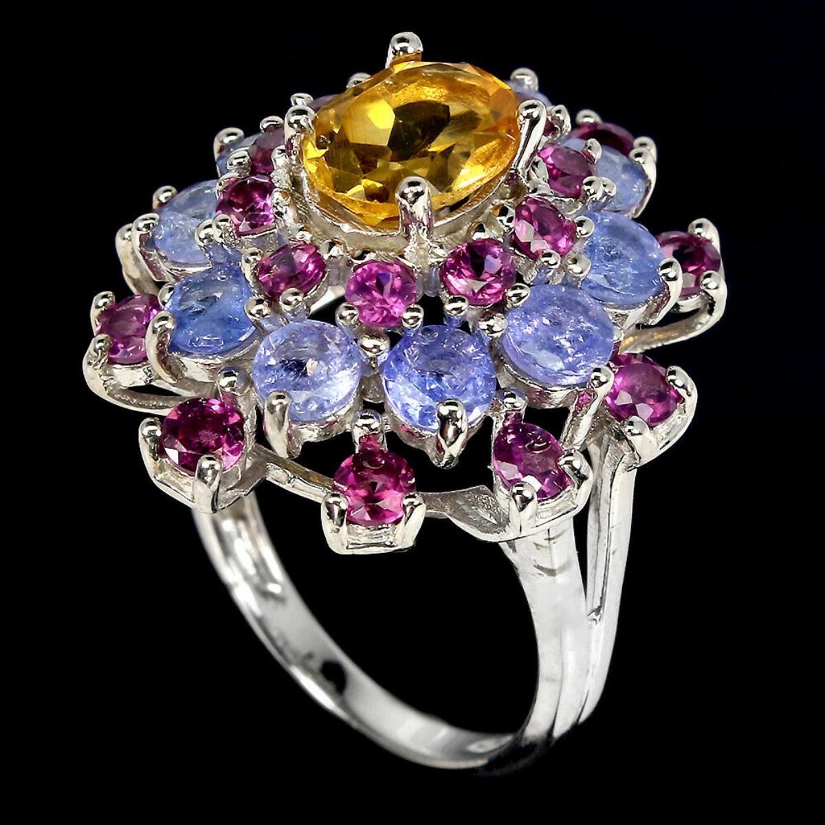 925 STERLING SILVER;PLATE-14K WHITE GOLD;RING SIZE(resizeable)8;MAIN STONE-CITRINE;OTHER GEMS-RHODOLITE GARNET, TANZANITE;TOTAL WEIGHT-7.83 GRAM (TOTAL WEIGHT OF SILVER + STONE)DIMENSION-* STONE 2.5 TO 9.0 X 7.0 MM. * RING SIZE 8.0 * FACE RING- 25.0 X 22.0 MM.;MAIN STONE SHAPE-OVAL CUT;MAIN STONE COLOR-TOP RICH YELLOW;CLARITY/GRADE-IF TO VVS;TREATMENT-UNHEATED;ORIGIN-BRAZIL;HARDNESS-7;