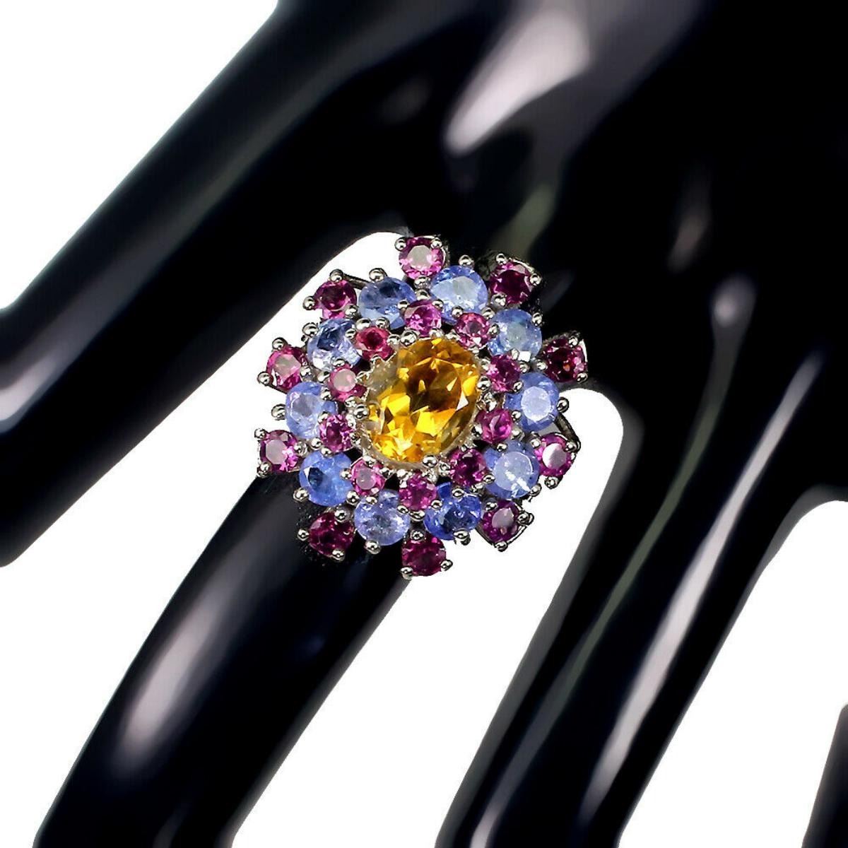 925 STERLING SILVER;PLATE-14K WHITE GOLD;RING SIZE(resizeable)8;MAIN STONE-CITRINE;OTHER GEMS-RHODOLITE GARNET, TANZANITE;TOTAL WEIGHT-7.83 GRAM (TOTAL WEIGHT OF SILVER + STONE)DIMENSION-* STONE 2.5 TO 9.0 X 7.0 MM. * RING SIZE 8.0 * FACE RING- 25.0 X 22.0 MM.;MAIN STONE SHAPE-OVAL CUT;MAIN STONE COLOR-TOP RICH YELLOW;CLARITY/GRADE-IF TO VVS;TREATMENT-UNHEATED;ORIGIN-BRAZIL;HARDNESS-7;