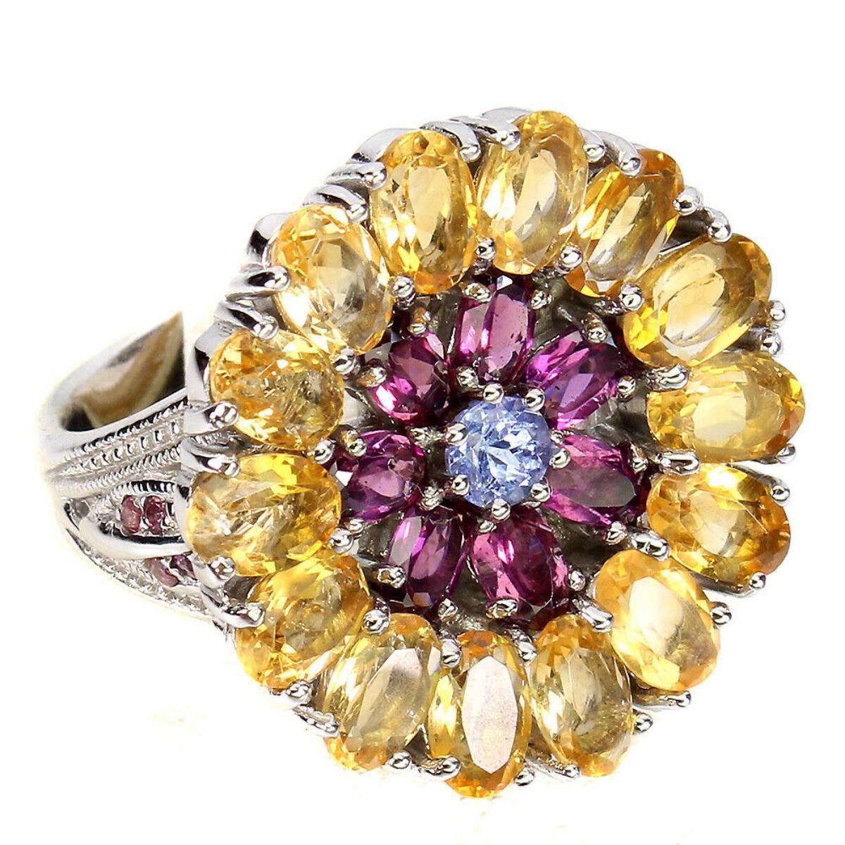 925 STERLING SILVER;PLATE-14K WHITE GOLD;RING SIZE/resizable-8;MAIN STONE-CITRINE;OTHER GEMS-RHODOLITE GARNET, TANZANITE;TOTAL WEIG-HT-13.21 GRAM (TOTAL WEIGHT OF SILVER + STONE)DIMENSION* STONE 1.0 TO 6.0 X 4.0 MM.;* RING SIZE- 8.0;* FACE RING- 25.0 X 25.0 MM.;MAIN STONE SHAPE-OVAL CUT;MAIN STONE COLOR-TOP RICH YELLOW;CLARITY/GRADE-IF TO VVS;TREATMENT-UNHEATED;ORIGIN-BRAZIL;HARDNESS-7;