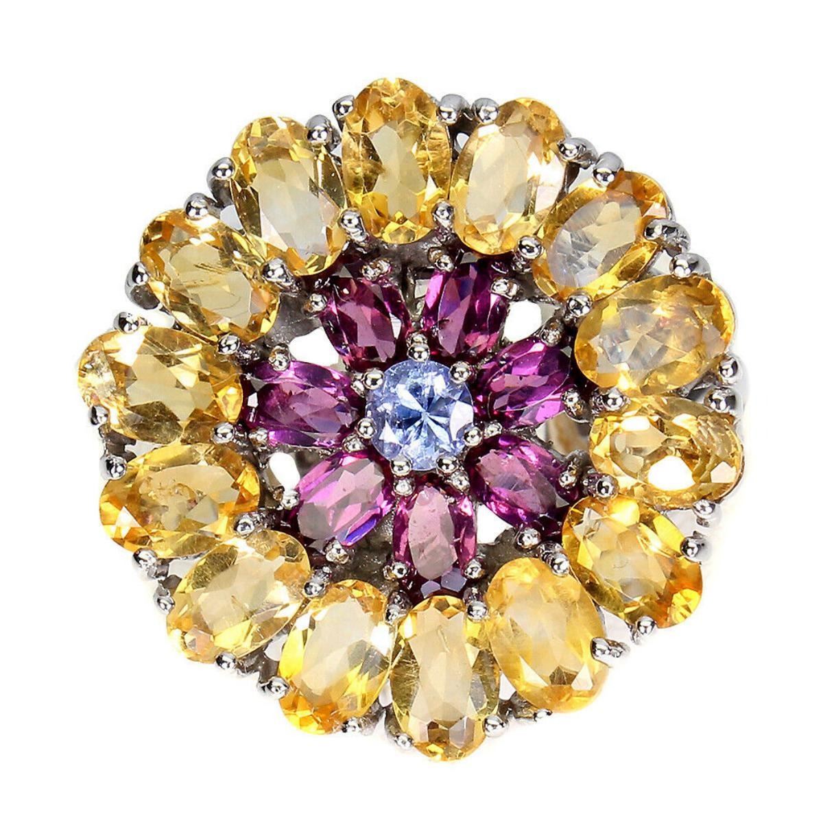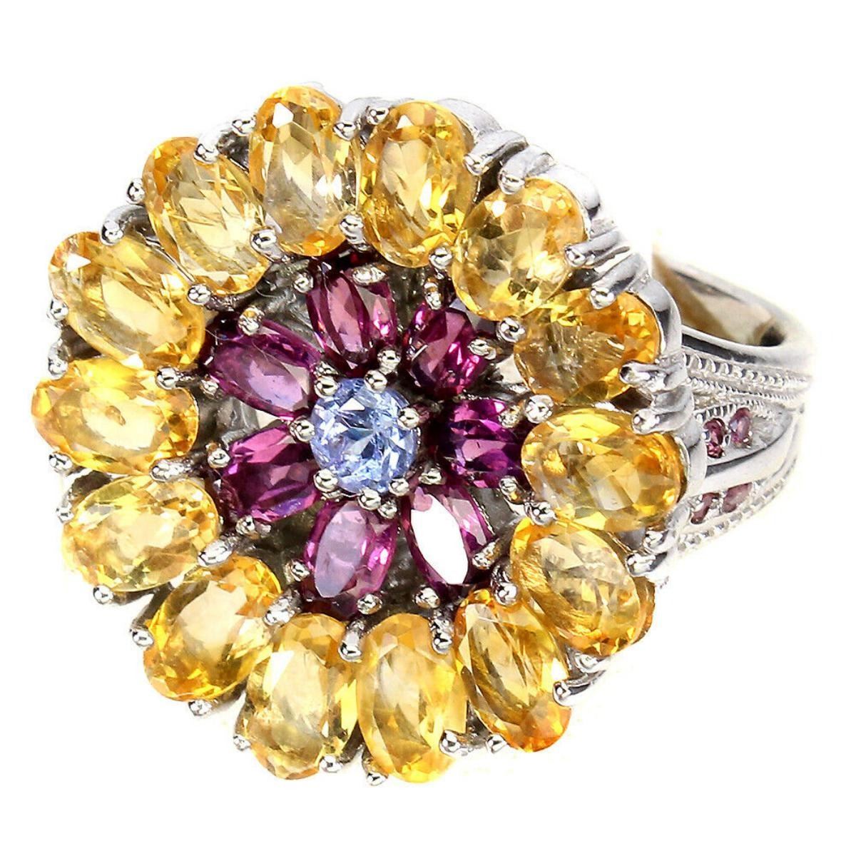 925 STERLING SILVER;PLATE-14K WHITE GOLD;RING SIZE/resizable-8;MAIN STONE-CITRINE;OTHER GEMS-RHODOLITE GARNET, TANZANITE;TOTAL WEIG-HT-13.21 GRAM (TOTAL WEIGHT OF SILVER + STONE)DIMENSION* STONE 1.0 TO 6.0 X 4.0 MM.;* RING SIZE- 8.0;* FACE RING- 25.0 X 25.0 MM.;MAIN STONE SHAPE-OVAL CUT;MAIN STONE COLOR-TOP RICH YELLOW;CLARITY/GRADE-IF TO VVS;TREATMENT-UNHEATED;ORIGIN-BRAZIL;HARDNESS-7;