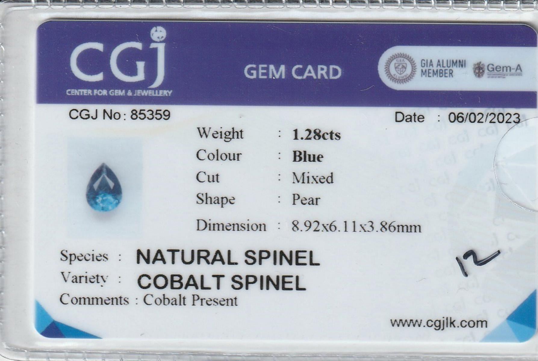 Natural Cobalt Blue Spinel 1.28 Cts - Untreated....Certified. Pear shape---eye clean; Size -8.92 x 6.11 MM; Origin - Vietnam;