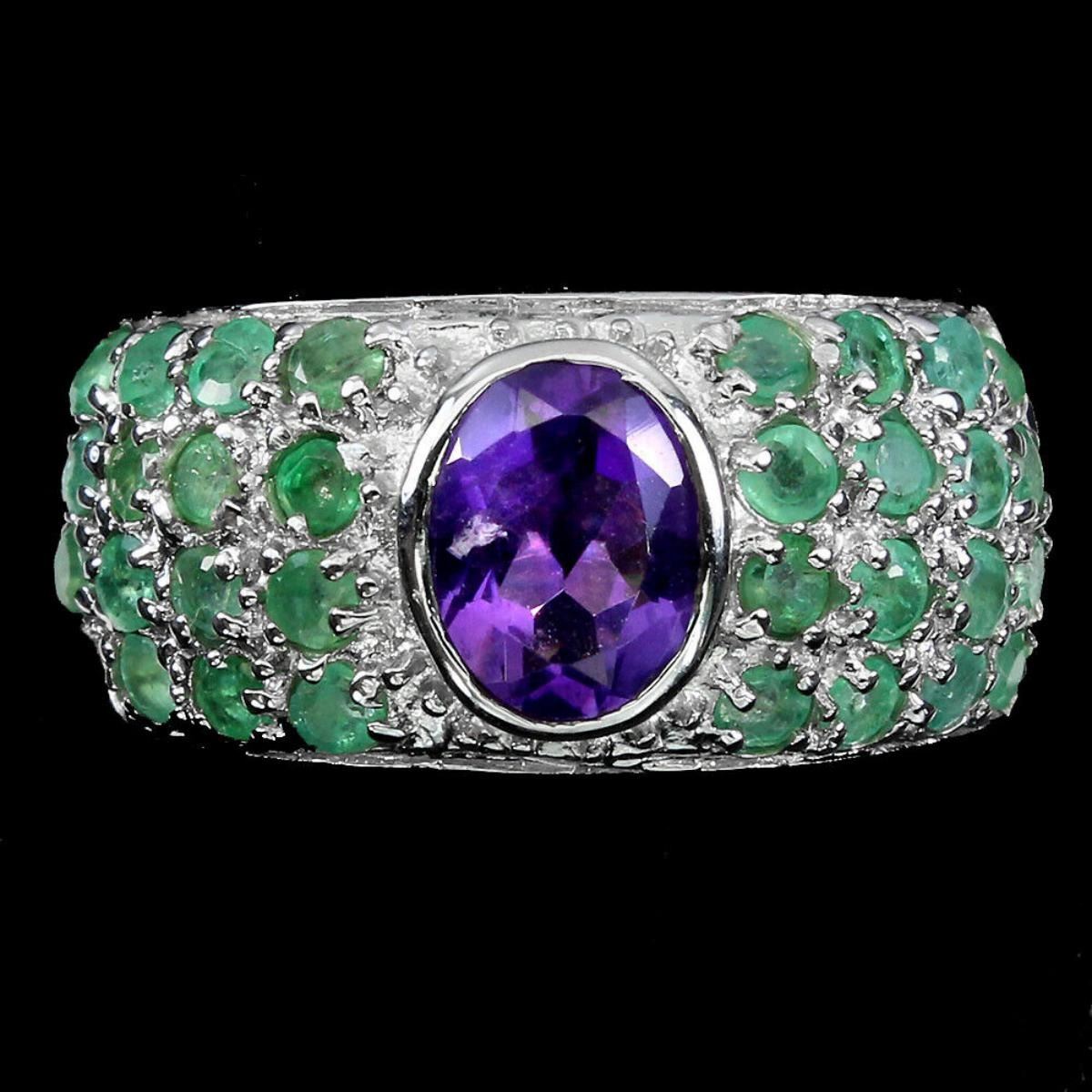 925 STERLING SILVER;PLATE-14K WHITE GOLD;RING SIZE/Resizeable -7.5;MAIN STONE-AMETHYST;OTHER GEMS-EMERALD;TOTAL WEIGHT-6.53 GRAM (TOTAL WEIGHT OF SILVER + STONE)DIMENSION-* STONE 2.0 TO 8.0 X 6.0 MM.;** FACE RING- 23.0 X 11.0 MM.;MAIN STONE SHAPE-OVAL CUT;MAIN STONE COLOR- RICH PURPLE;CLARITY/GRAD-EIF TO VVS;TREATMENT-UNHEATED;ORIGIN-COLOMBIA/BRAZIL;HARDNESS-7;
