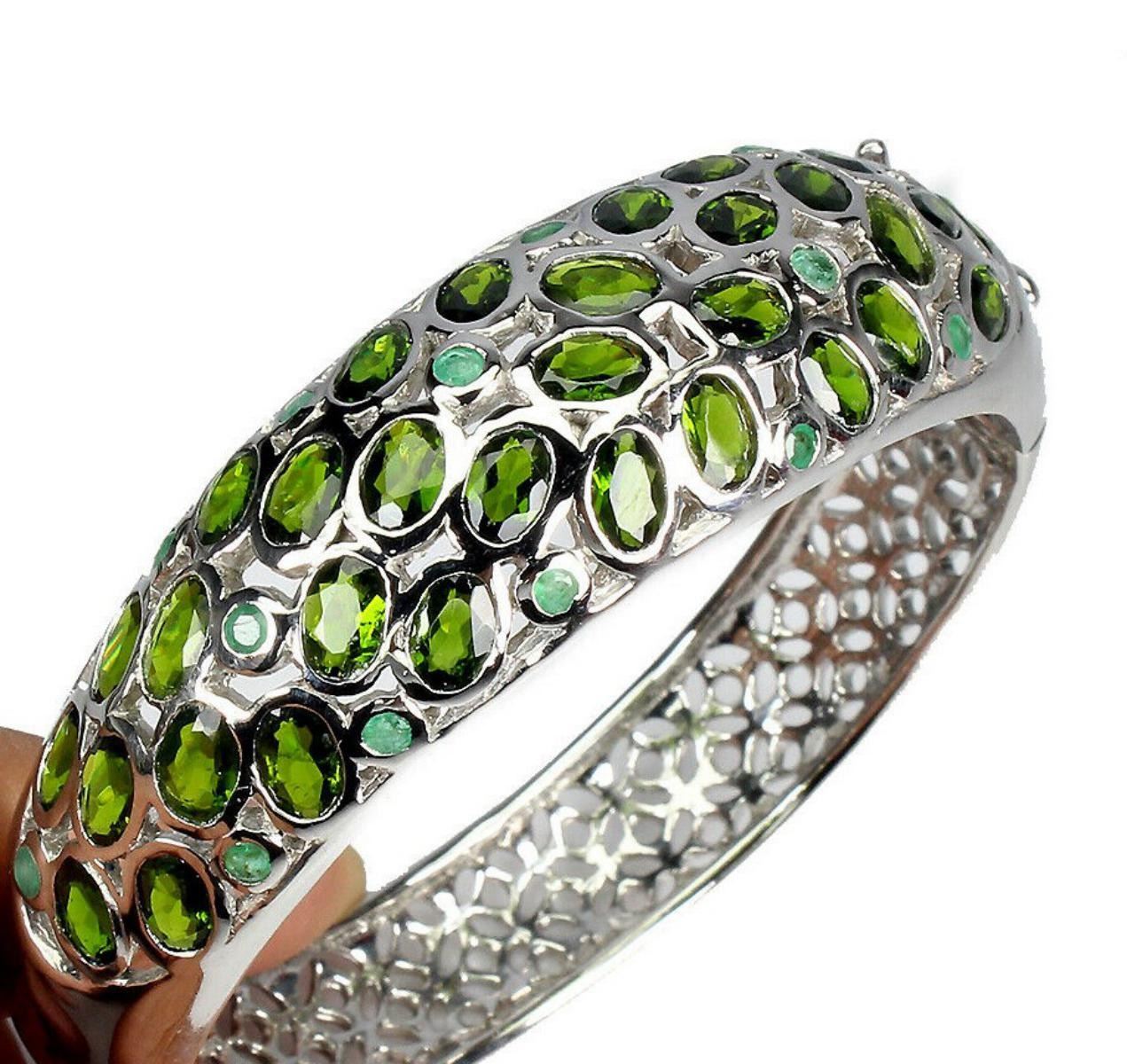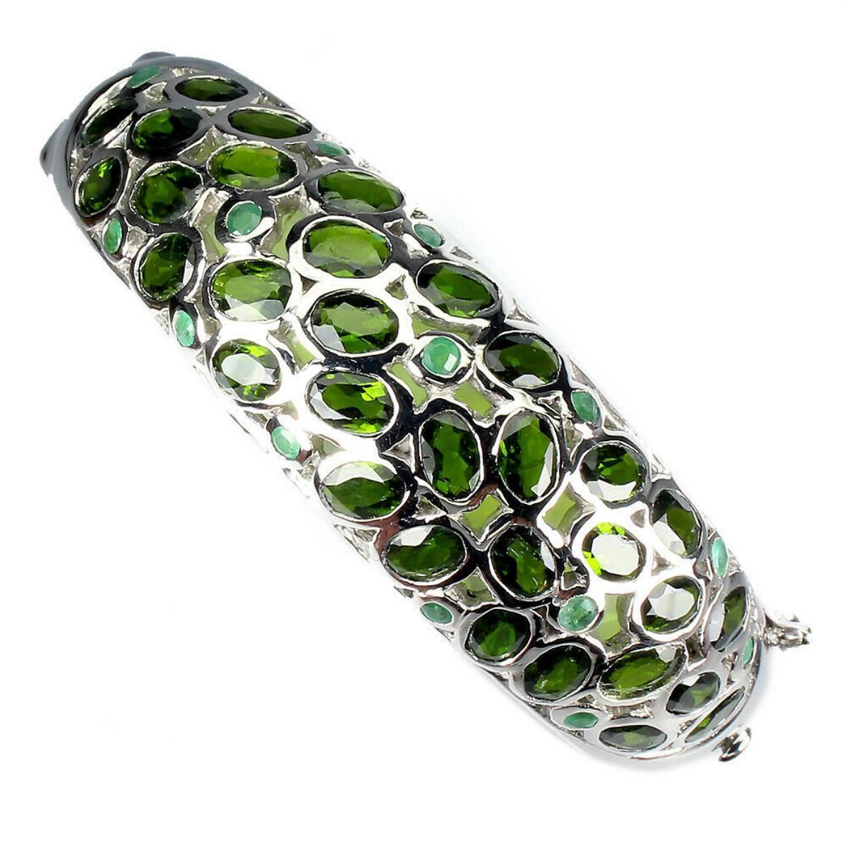 925 STERLING SILVER;PLATE-14K WHITE GOLD;MAIN STONE-CHROME DIOPSIDE;OTHER GEMS-EMERALD;TOTAL WEIGHT-40.08 GRAM (TOTAL WEIGHT OF SILVER + STONE 200 cts approx)DIMENSION-* STONE 2.5 TO 6.0 X 4.0 MM. * DIAMETER 2.3 X 2.3 INCHES. * FACE BANGLE 62.0 X 18.0 MM.;MAIN STONE SHAPE-OVAL CUT;MAIN STONE COLOR-TOP RICH GREEN;CLARITY/GRADE-IF TO VVS;TREATMENT-UNHEATED;ORIGIN-RUSSIA & Colombia;HARDNESS-5.0 - 5.5;