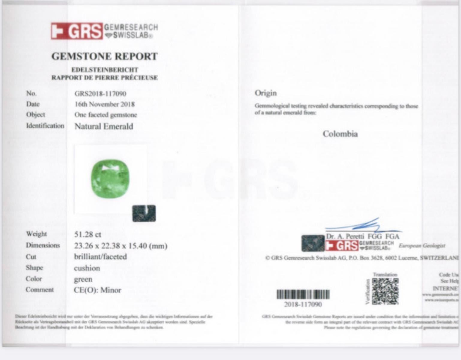 Natural Colombian Emerald - GRS Certified.....Weight 51.28 Cts; Cushion cut; Clarity - same as Images;Certified by GRS Swiss Lab