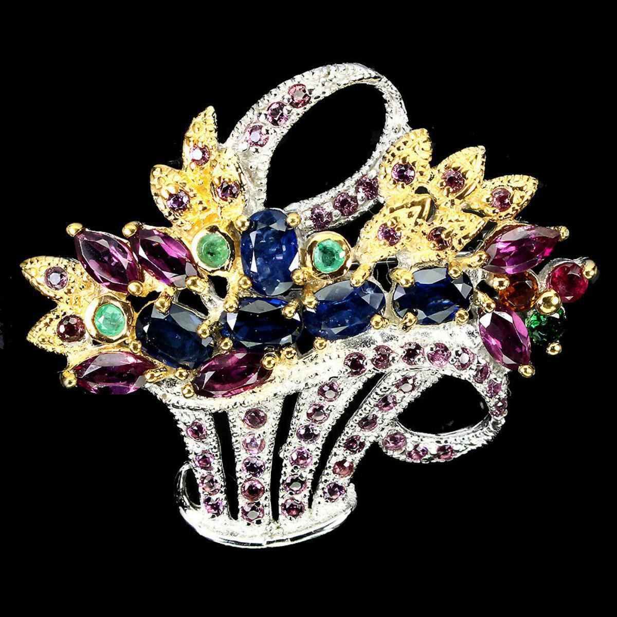 925 STERLING SILVER;PLATE-2-TONE WHITE & YELLOW 14K GOLD;MAIN STONE-KYANITE;OTHER GEMS-EMERALD, RHODOLITE GARNET;TOTAL WEIGHT-7.88 GRAM (TOTAL WEIGHT OF SILVER + STONE)DIMENSION-* STONE 1.0 TO 6.0 X 4.0 MM. * FACE BROOCH 40.0 X 33.0 MM.;MAIN STONE SHAPE-OVAL CUT;MAIN STONE COLOR-TOP RICH BLUE;TREATMENT-UNHEATED;